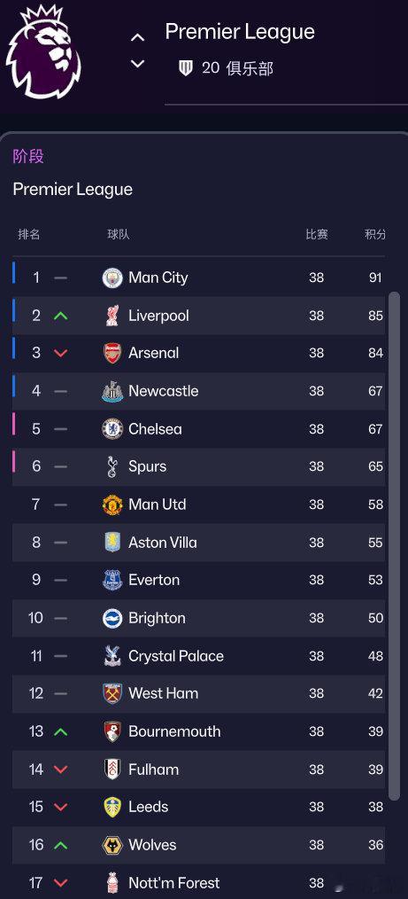 【足球经理26,开档模拟英超第一个赛季的结果】曼城冠军,利物浦第二,阿森纳第三,纽卡第四,切尔西第五,热刺第六,曼联第七。
