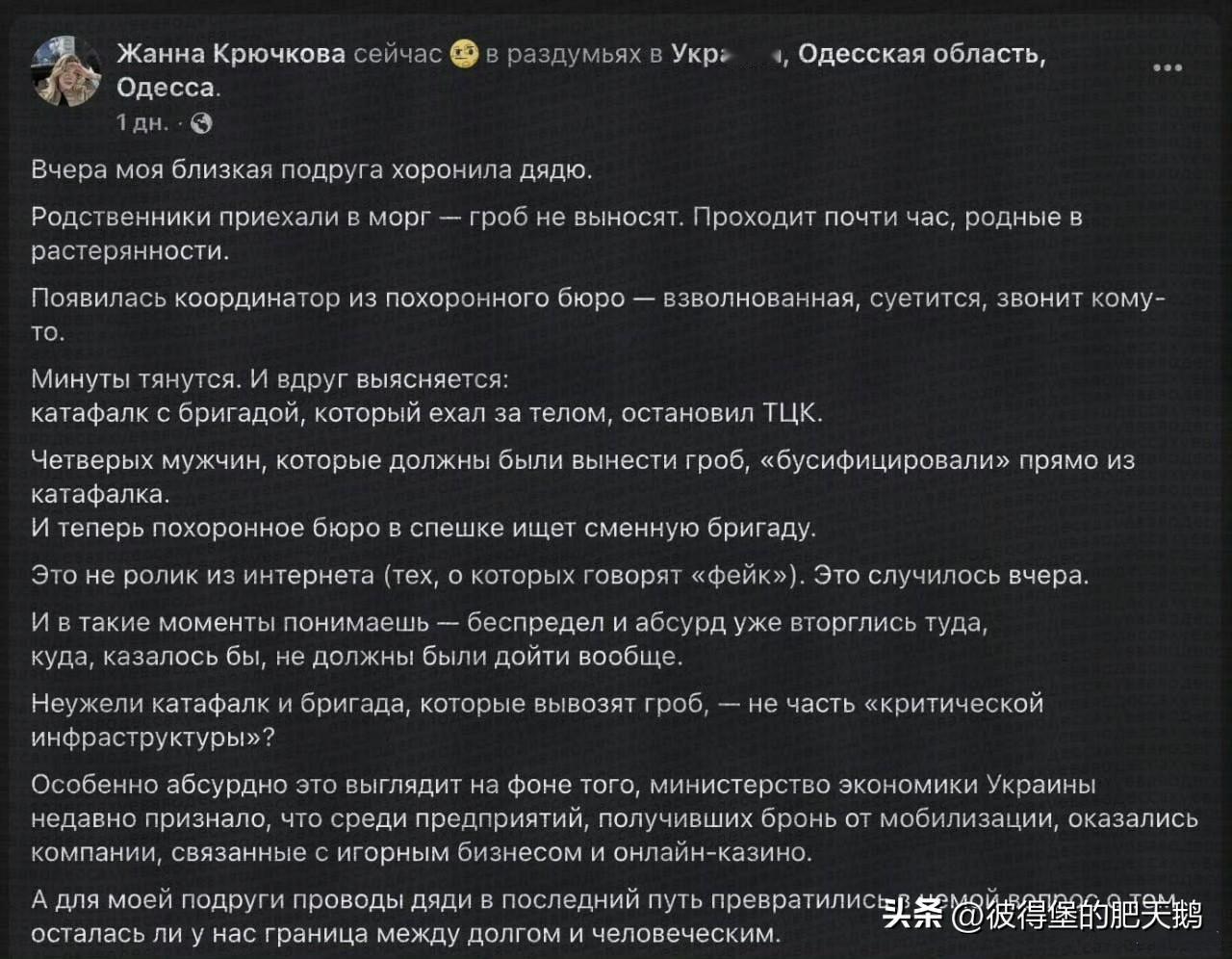 尽管肥鹅看过太多乌克兰征兵办没下限的抓壮丁行为,但这个消息再一次刷新了我对乌克兰征兵办没下限的认知。 敖德萨一名女子称,兵役办匪帮在去墓地的必经之地抓走了抬棺材的殡葬工。 抓壮丁抓得已经毫无人性了!泽连斯基团伙疯狂至极! 乌克兰征兵办的人不想上战场,所以为了完成KPI就不得不继续刷新其抓丁下限。 热点观点别太荒谬
