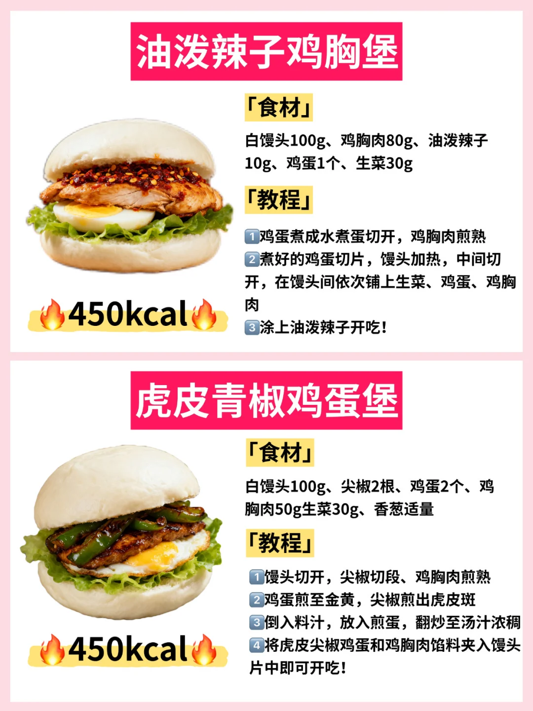 🙋姐妹们!给大家整理了六款低卡馒头堡的做法!健康饱腹,而且好吃到流泪😭!姐妹们一定要试试!! ✅经典鸡胸肉蛋堡 ✅番茄意式肉酱堡 ✅西葫芦鲜虾蛋堡 ✅孜然牛肉蔬菜堡 ✅油泼辣子鸡胸堡 ✅虎皮青椒鸡蛋堡 ⭐️小tips: 馒头选择白馒头!很干净的碳水! 优先蒸,或者用不粘锅无油小火煎~ 酱料用低卡酱料,不用也好吃~ 💗姐妹们一定要收藏起来去试试,真的巨巨巨好吃~