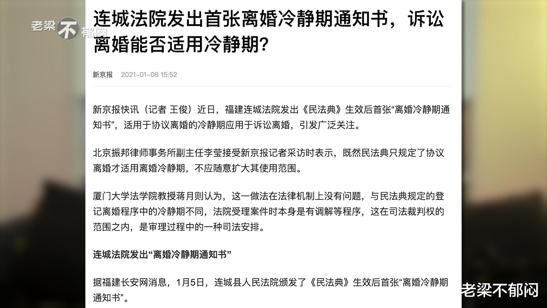 但是在民法典实施后没多久,新京报就报道,福建连城法院发出《民法典》生效后首张“离婚冷静期通知书”,当时这个报道也引发了争议。