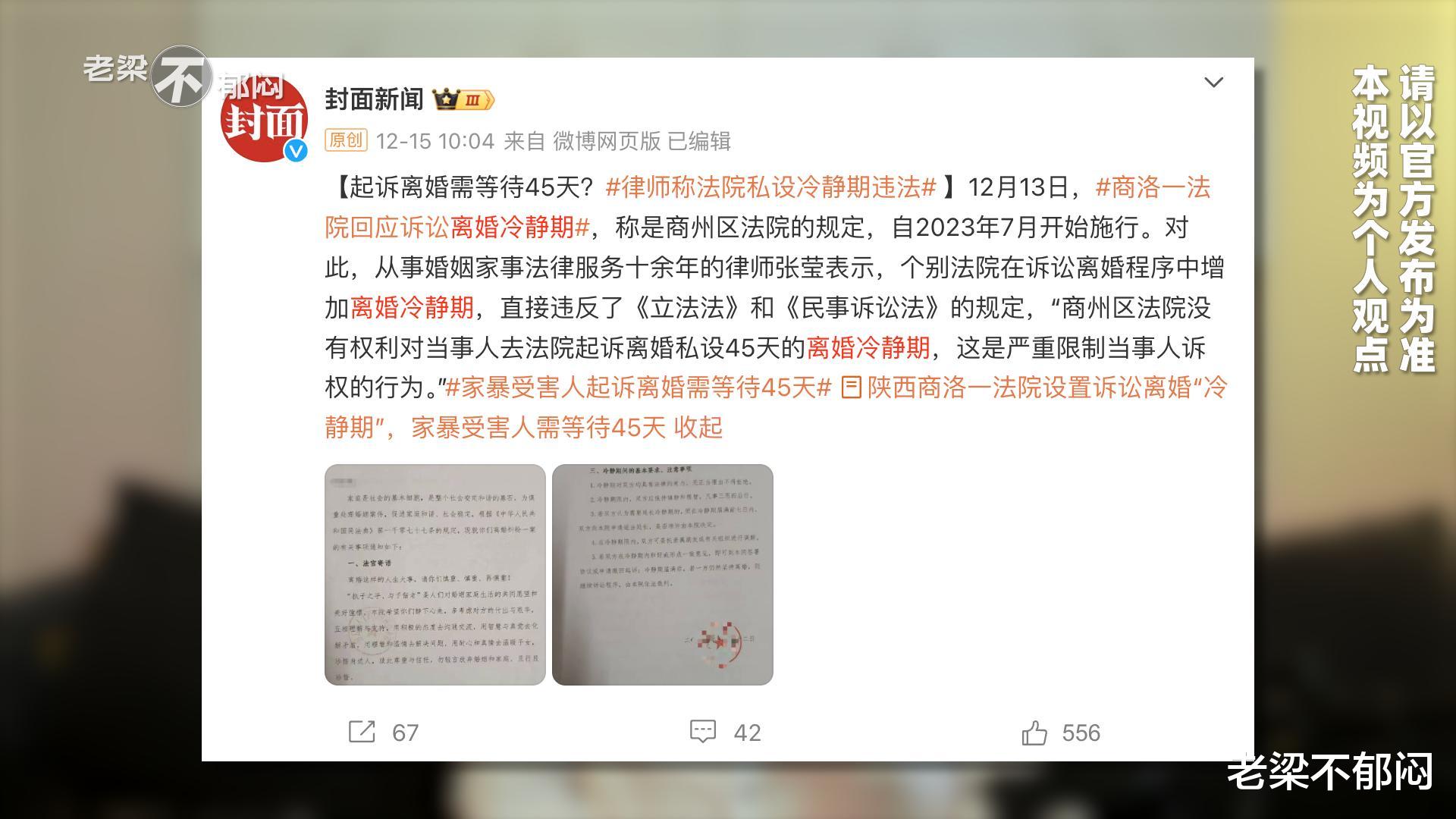 暂时没有采访到被起诉的另一方当事人,所以这个案子是否涉及家暴还不确认,倒是封面新闻记者采访了法院,商州区法院规定,自2023年7月开始,起诉离婚有45天离婚冷静期。
