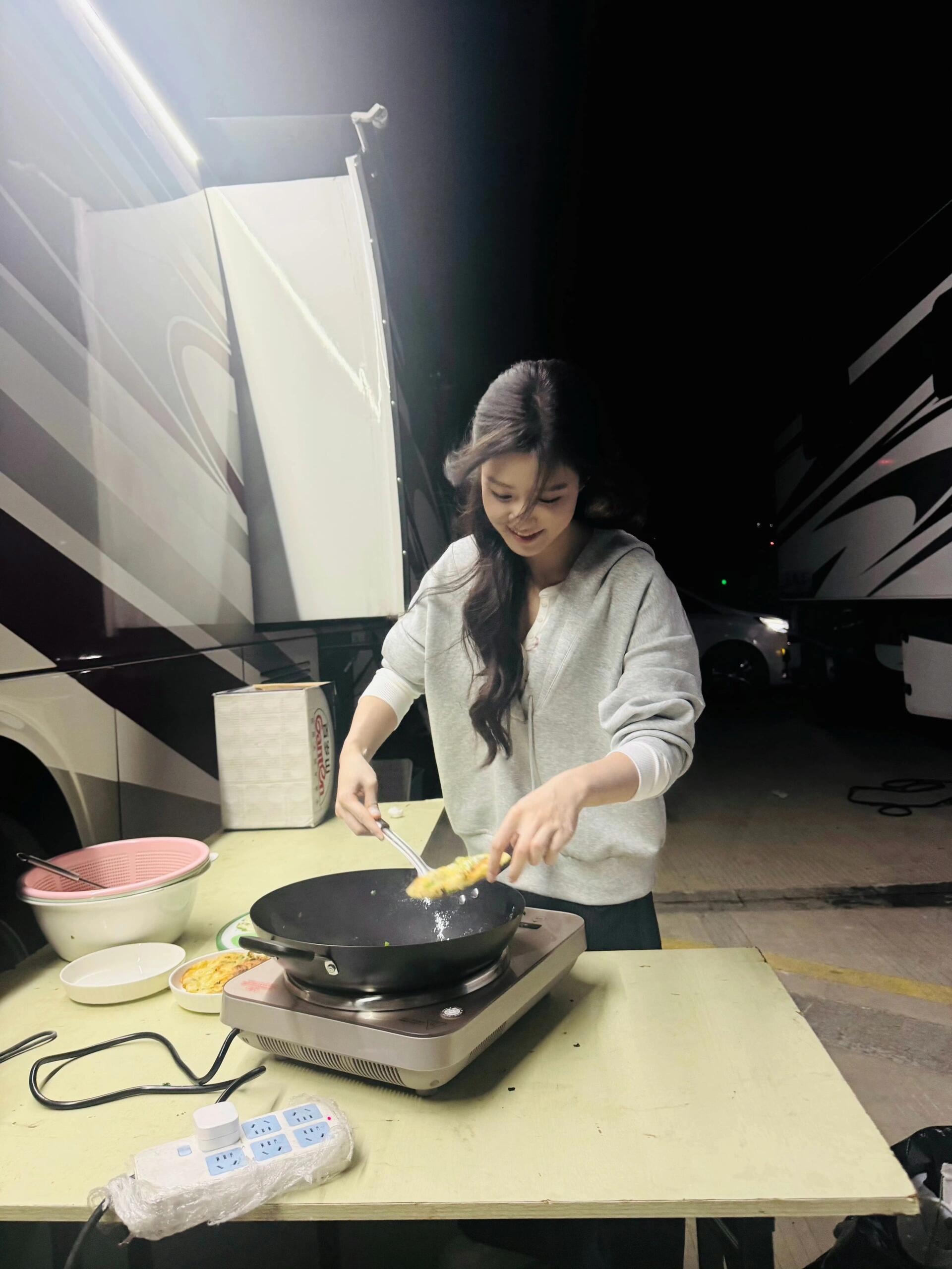 卢昱晓在片场做起了葱油饼