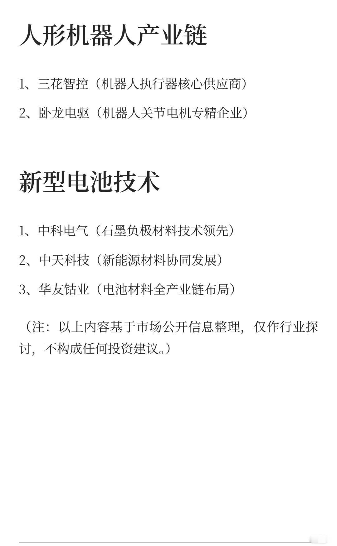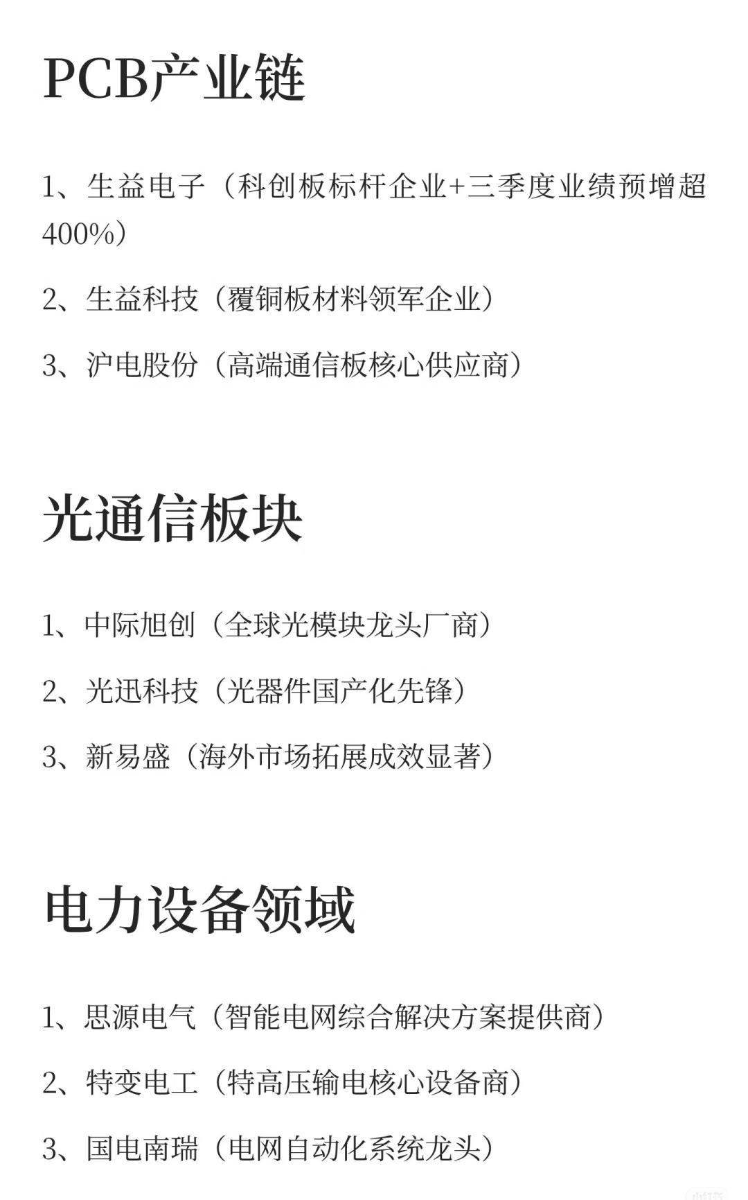 一、下周市场热点板块及关注方向前瞻 聚焦的产业方向主要包括:PCB(印制电路板)、光通信、电力设备等核心电子产业链,同时关注各领域的行业龙头与技术发展趋势。 二、重点产业链及代表企业分析 1. PCB(印制电路板)产业链 PCB 是电子元器件的基础载体,广泛应用于通信、计算机、汽车等领域。该领域代表性企业包括: - 生益电子:科创板标杆企业,第三季度业绩预增超400%,表现极为亮眼。 - 生益科技:覆铜板材料领域的领军企业,为PCB上游关键材料供应商。 - 沪电股份:高端通信板核心供应商,在通信设备PCB领域具有显著优势。 👉 PCB板块整体受益于5G、服务器、AI算力等下游需求增长,高端产品与国产替代趋势明显。 2. 光通信板块 光通信是数据传输的“高速公路”,随着数据中心、5G、AI算力网络建设加速,光模块与光器件需求旺盛。主要企业有: - 中际旭创:全球光模块龙头厂商,技术先进、市场份额高。 - 光迅科技:国内光器件国产化先锋,推动关键元器件自主可控。 - 新易盛:在海外市场拓展方面成效显著,具备较强的国际竞争力。 👉 光通信板块受益于全球数据流量爆发与算力基建浪潮,光模块升级(如800G、1.6T)成为重要看点。 3. 电力设备领域 电力设备支撑能源传输与智能电网建设,尤其在特高压、新能源并网、电网智能化方向需求强劲。代表企业包括: - 思源电气:智能电网综合解决方案提供商,覆盖多个电网环节。 - 特变电工:特高压输电核心设备商,为电力远距离输送提供关键装备。 - 国电南瑞:电网自动化系统龙头,深度参与智能电网与数字电网建设。 👉 电力设备板块在“双碳”目标与新型电力系统构建背景下,迎来新一轮投资与技术升级周期。 三、新兴科技产业动态 1. 人形机器人产业链 人形机器人是未来智能制造与服务业的重要载体,关键零部件供应是产业链核心。关注企业包括: - 三花智控:机器人执行器核心供应商,控制与驱动系统是其强项。 - 卧龙电驱:机器人关节电机专精企业,专注于高精度、高可靠性电机研发。 👉 人形机器人正从技术验证走向产业化探索,执行器、电机、传感器等是当前技术突破重点。 2. 新型电池技术 新能源与储能的发展离不开电池技术的持续创新,重点企业有: - 中科电气:在石墨负极材料领域技术领先,负极是锂电池的关键组成部分。 - 中天科技:新能源材料协同发展,涵盖光纤、电力、新能源多领域。 - 华友钴业:布局电池材料全产业链,从钴镍资源到正极材料一体化能力强。 👉 新型电池技术正向高能量密度、长寿命、低成本方向演进,材料创新与供应链安全是关键。 四、免责声明 (注:以上内容基于市场公开信息整理,仅作行业探讨,不构成任何投资建议。) ✅ 总结建议关注方向: - 短期可重点跟踪 PCB(尤其是业绩高增企业)、光通信(光模块/器件)、电力设备(特高压/智能电网) 等板块的龙头动向; - 中长期可关注 人形机器人核心零部件(执行器、电机)、新型电池材料(负极、钴镍、正极等) 的技术突破与产业化进展。