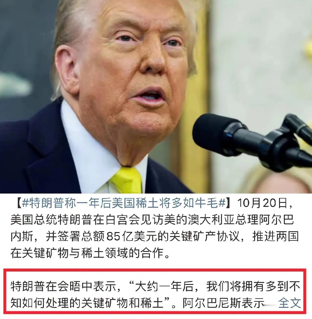 特朗普在20日说:“大约一年后,我们将拥有多到不知如何处理的关键矿物和稀土。” 真特么大实话! 没有提炼精炼技术,可不就多到不知道如何处理。不知如何处理的关键矿物和稀土跟废物有什么区别?这也拿出来炫耀?特朗普这个习惯性嘚瑟没治了。
