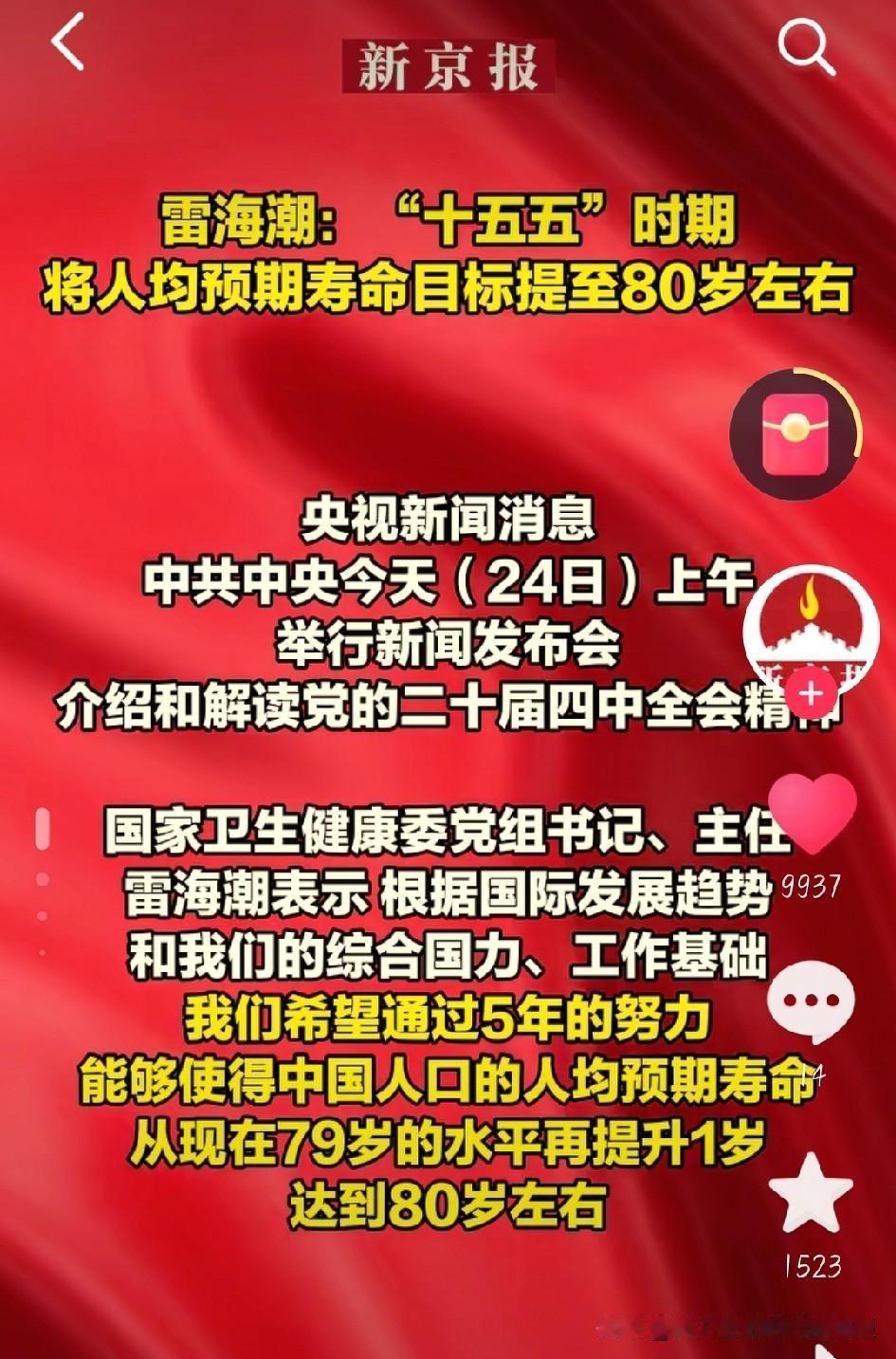 刚看到新闻,国家说要花5年时间,把人均预期寿命从现在的79岁提到80岁左右。别觉得这是个虚数,其实跟咱老百姓的日子紧紧挂钩。 能有这目标,本身就挺牛的。想想这些年,医疗越来越给力,以前吓人的大病现在不少能控制住;公园的健康步道越修越多,小区里跳广场舞的大爷大妈也越来越精神 。而且已经有北京、上海这些地方,人均寿命早超80岁了,说明这目标靠谱。 但想多活这一岁,光靠国家可不行。现在慢性病是健康大敌,好多都跟吃太饱、不动弹有关 。院士都说了,吃八成饱、别穿太暖反而能启动长寿基因。 说白了,国家给咱搭好了医疗、健身的台子,能不能站上80岁的线,还得靠自己管嘴、迈开腿。毕竟长寿的关键,是健康地活,不是躺着熬日子啊!人均预期寿命目标提致80岁左右 十五五规划纲要 中国十五五规划 图片截图于新京报