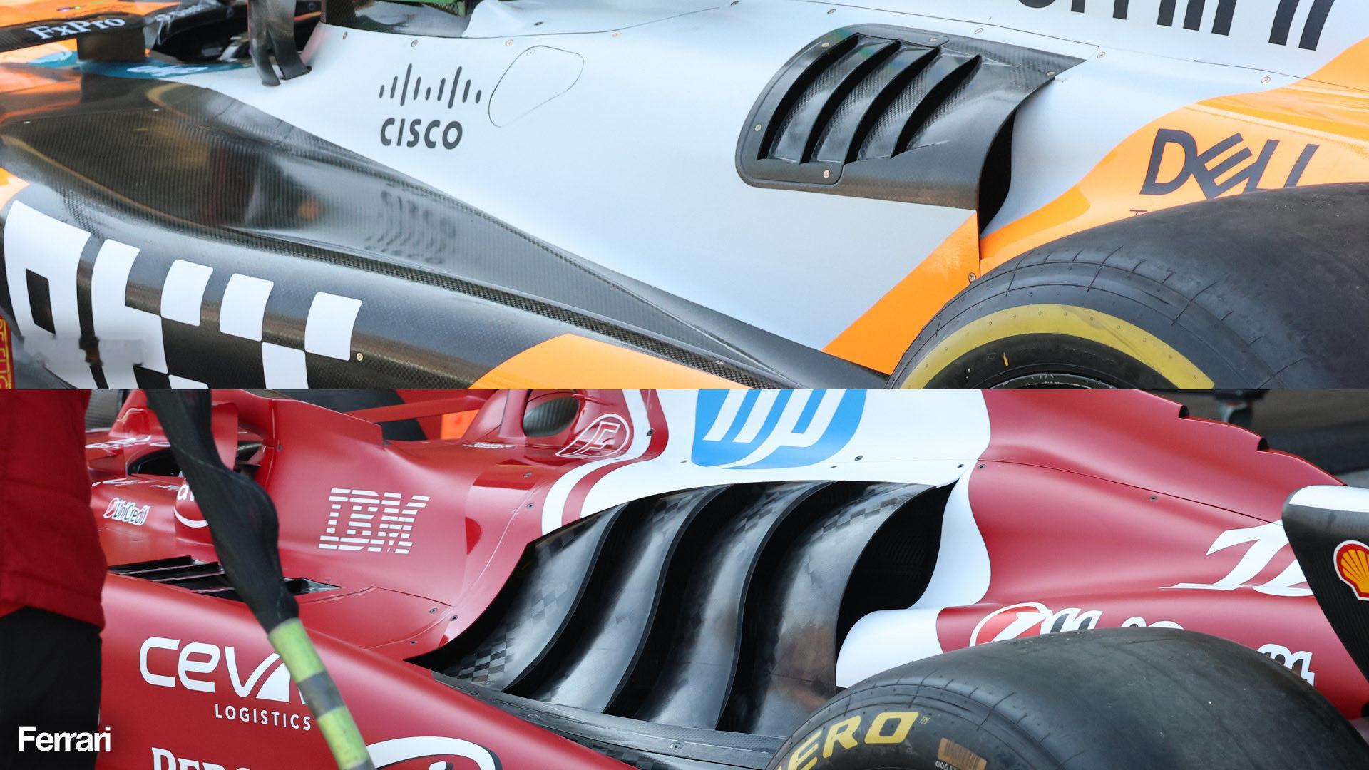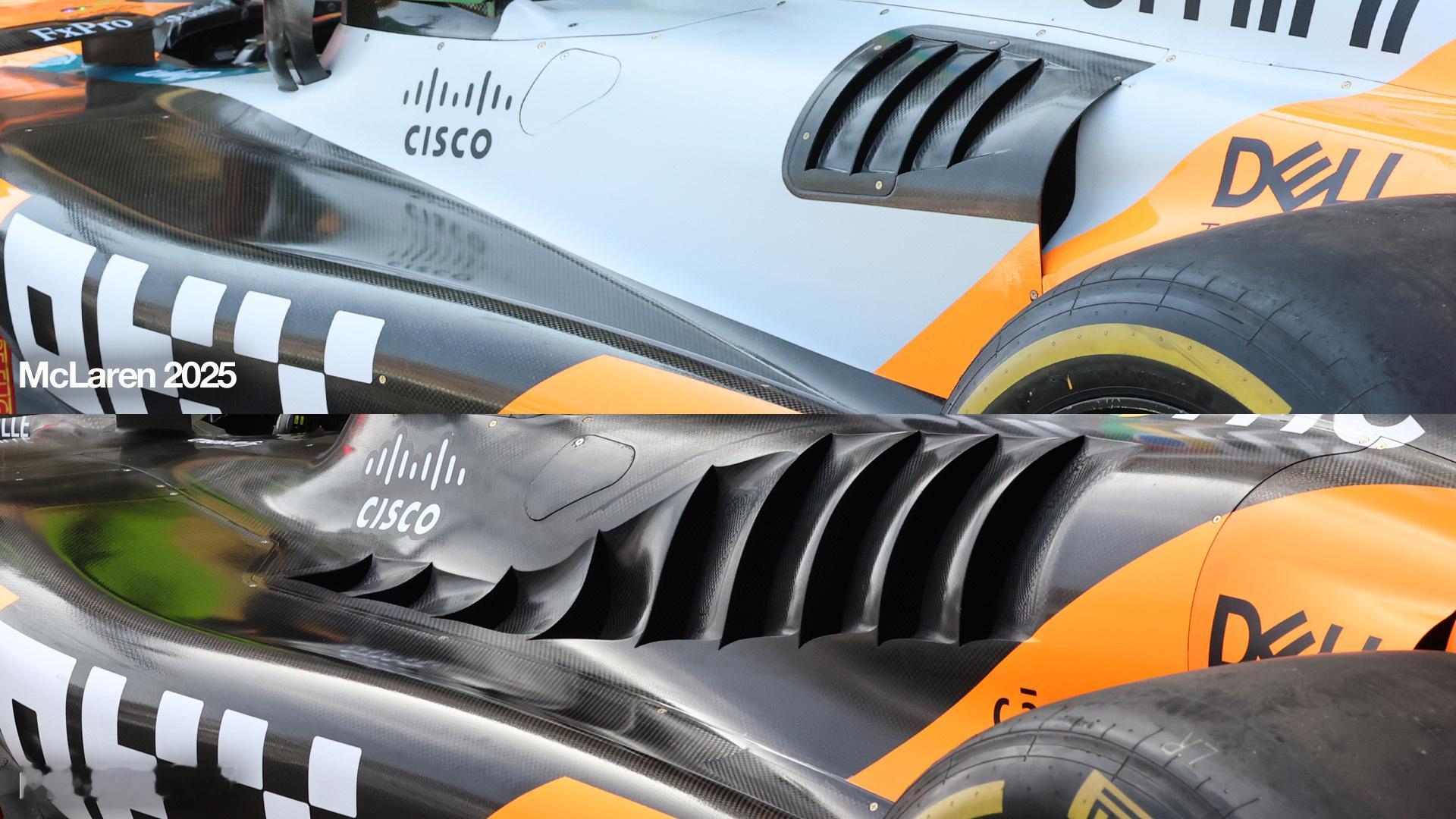 迈凯伦赛车引擎盖散热开口与法拉利红牛以及去年赛车的对比(via the race)