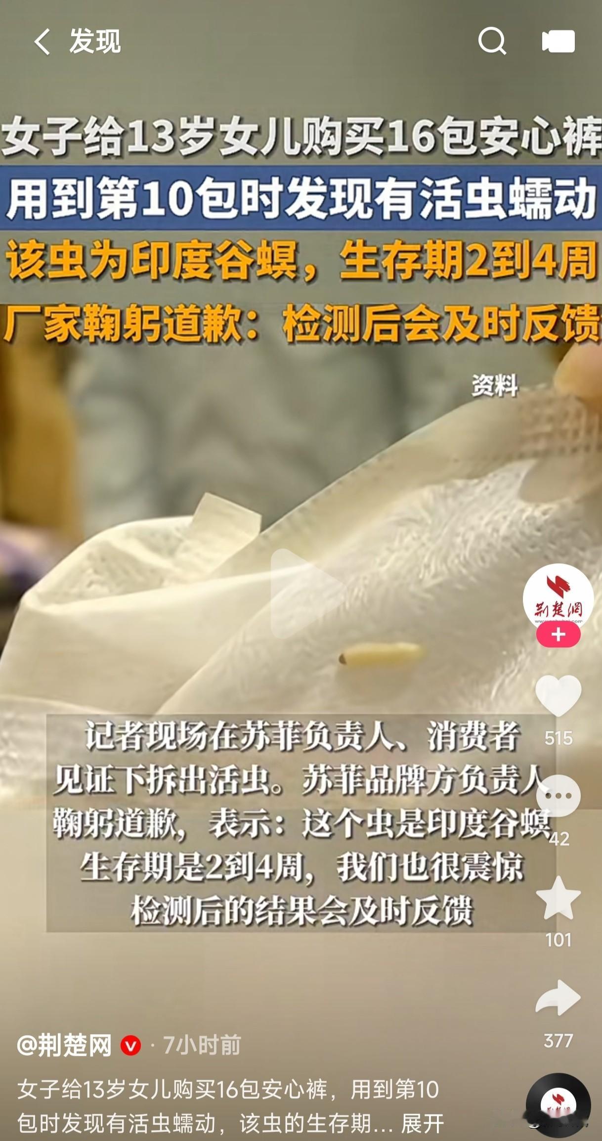 女子给13岁女儿买了16包安心裤,用到第10包时发现里面有活虫在蠕动,品牌方见这种情况也甚是震惊。 这种虫的生存期居然是2到4周,这究竟是什么原因才会出现这种问题?这安心裤光名字起的好听,这也太让人安心了,本来是为了身体健康才买它的,结果用到最后却发现一点都不安心,这里面的活虫到底是从何而来? 这品牌方见到这种情况也甚是震惊,只能是给消费者鞠躬道歉,他们也一脸懵逼,到底是哪个环节出问题了只能通过检测后才能得知,这苏菲也是市面上公认的大牌子,为何会出现这种情况呢?到底是采购的原材料是质量不合格的?还是在制造方面出了问题?这个突然发现的活虫真是让人太震惊了,这以后还敢买吗?