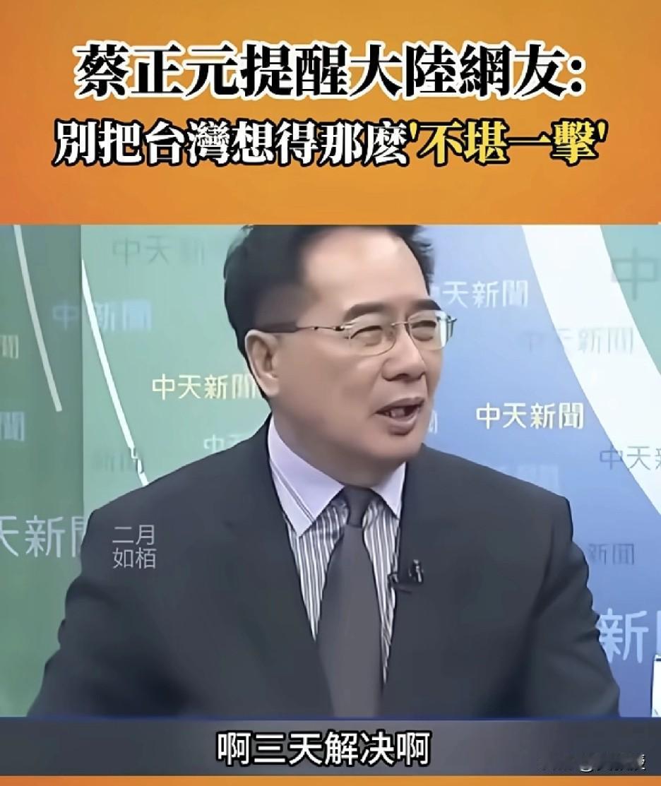 在大陆互联网 很多网友想象的,都是一觉醒来,统一了 三天,台湾蛙蛙兵,草莓兵就投降了 你们喜爱的蔡正元教授 告诉网友,“什么不战而胜啊,三天解决啊”,别把台湾想的不堪一击 大家怎么看?