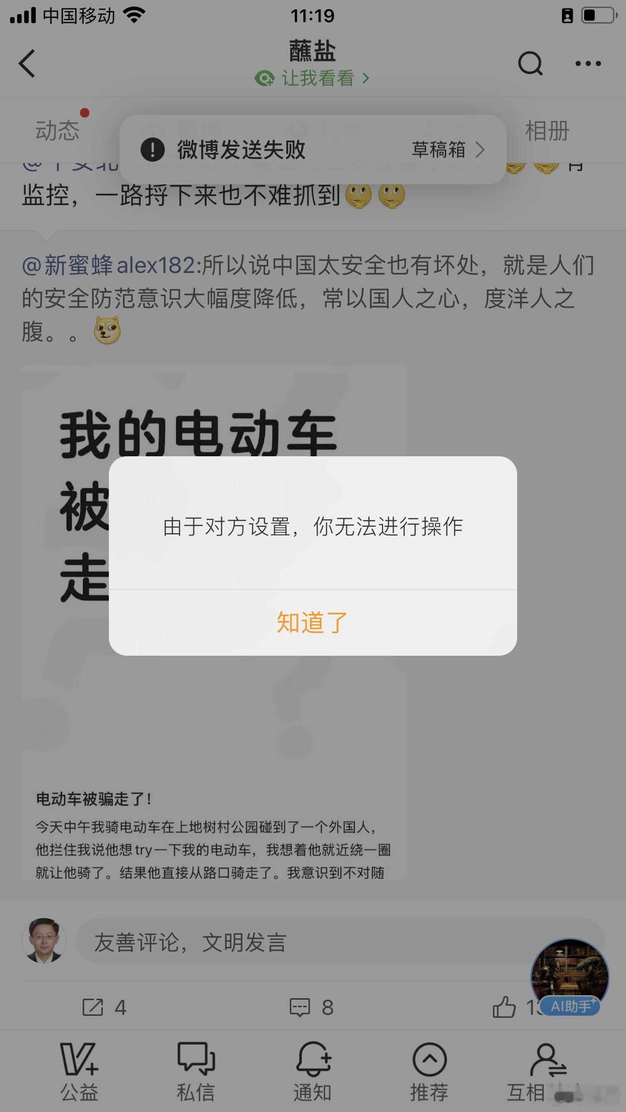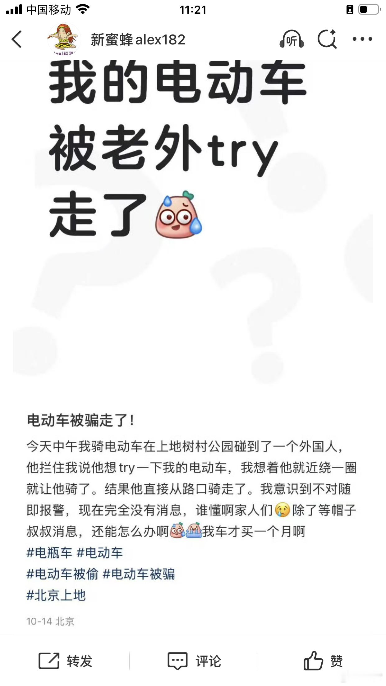 被小蜂蜜拉黑了,截图转下,上地村树公园也有监控,太气人,坐等偷车外国人落网!