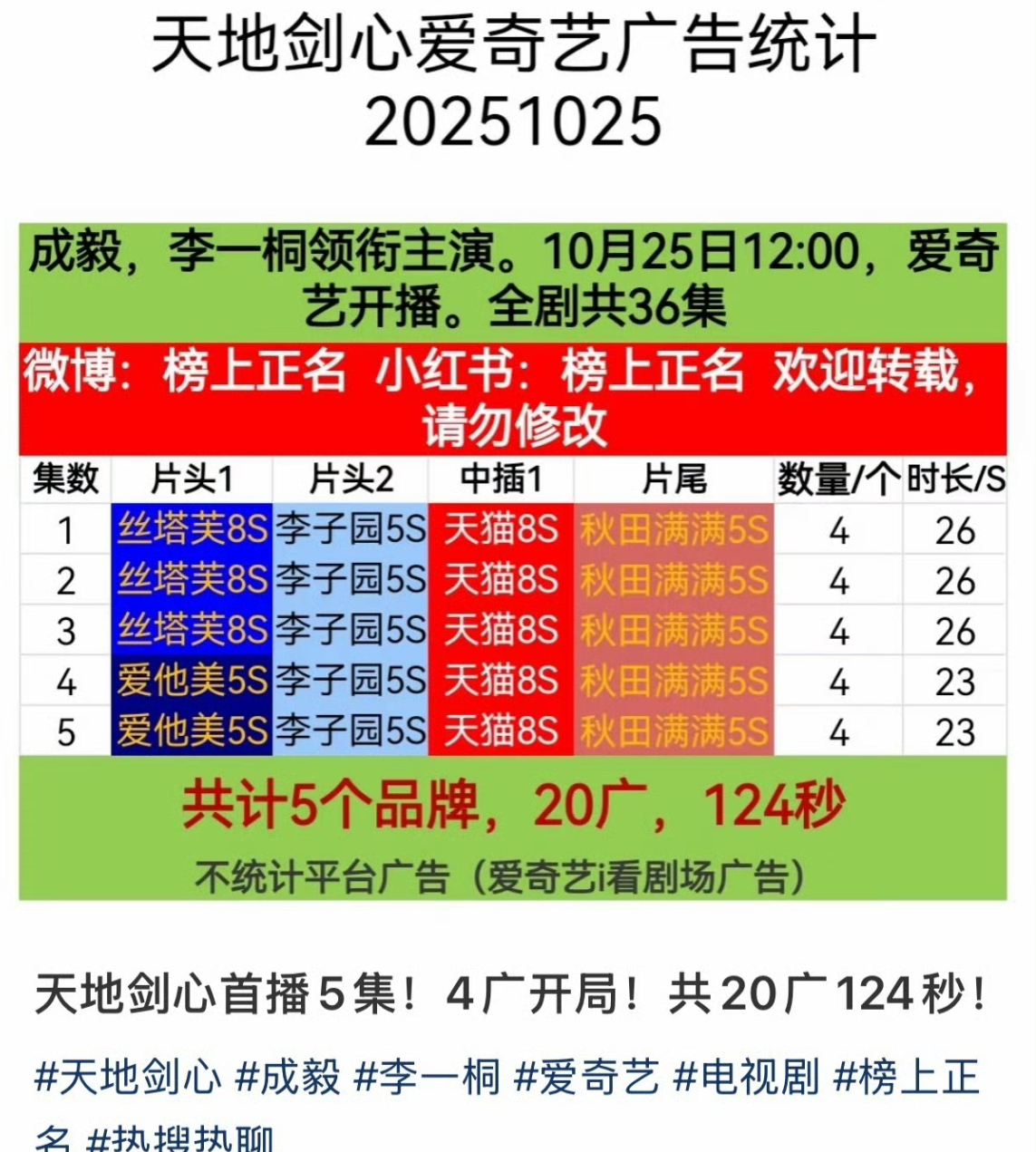 成毅《天地剑心》广告统计:首播5集,4广开局,共20广124秒!品牌方是最有眼光的!