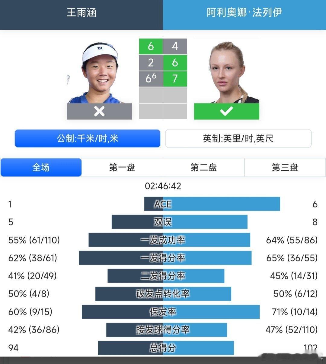 小将王雨涵🇨🇳6-4/2-6/6-7(6)不敌法列伊🇧🇾,无缘晋级决胜轮。下一站加油![加油]