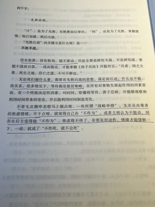 书里最震撼我的一句话是:“善战者,无智名,无勇功。”真正的高手,他们的胜利看起来平淡无奇,因为他们赢得太顺理成章。其最高境界是“不战而屈人之兵”。