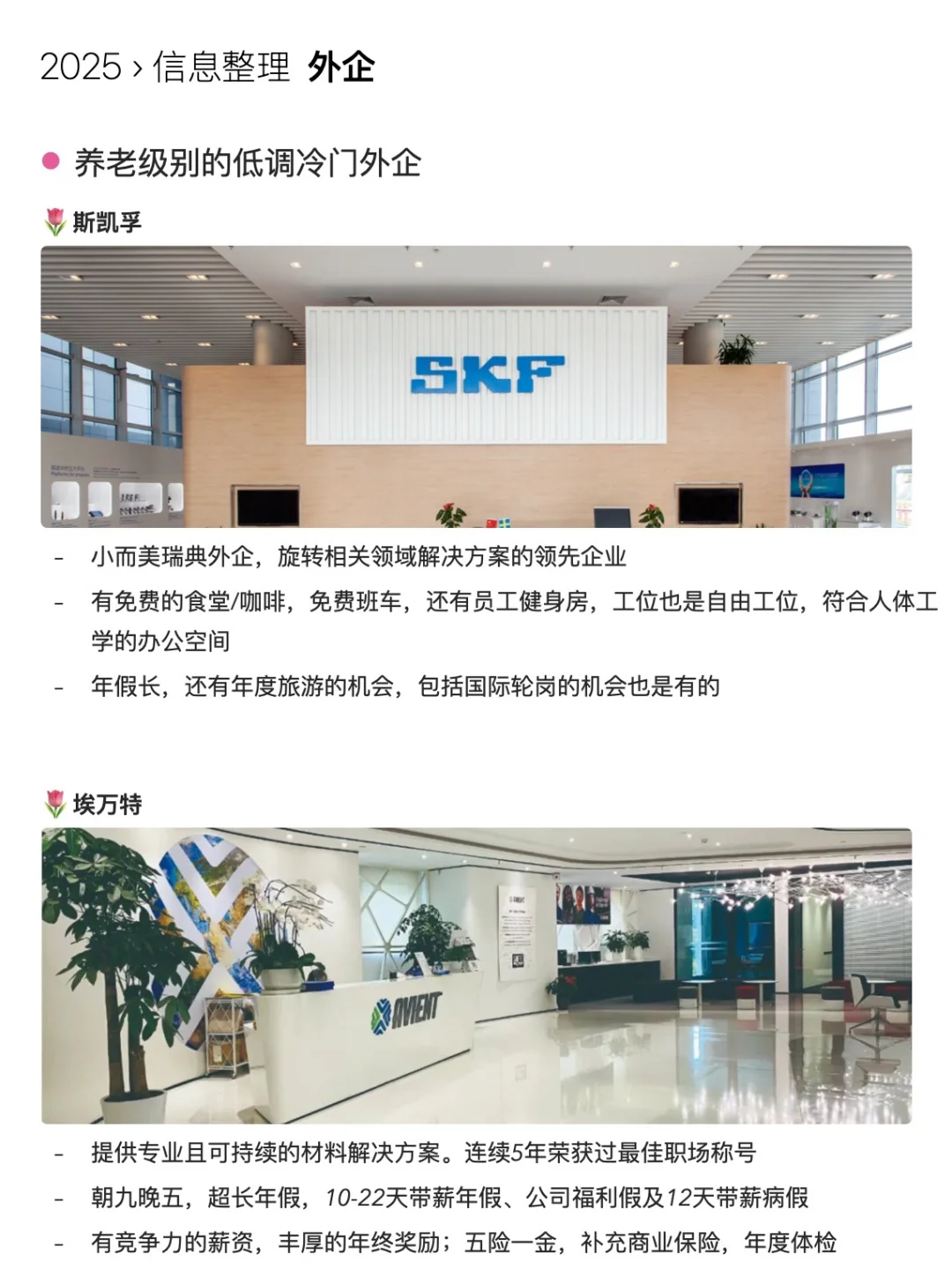 都说外企香,但只有这种“养老级”外企才是最终归宿,这些公司就像“职场桃花源”,因为里面的人一待就是几十年,所以名额很少,看到了就赶紧冲一波吧 . 它们把“稳定安逸”刻进了DNA ✔️专攻产业链一环,是业内隐形王者,不追风口,业绩稳如泰山 ✔️拒绝狼性文化,没有紧急推送,下班后的时间完全属于自己 ✔️五险一金顶格缴,年假15天起步,病假不扣钱,关怀直接拉满 ✔️不卡35岁,经验在这里是财富,越老越吃香 . 坚持日更✊🏻,帮大家在找工作路上顺利拿到offer! .