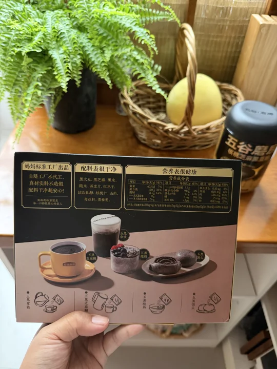 用到的五谷磨房五黑粉,除了黑芝麻、黑大豆、黑米、黑藜麦、奇亚籽这五黑食材,还有非常适合这个季节的山药、红枣、核桃仁。没有蔗糖香精色素,配料表都是些天然五谷,五谷为养,吃起来很安心,满满的谷物醇香。