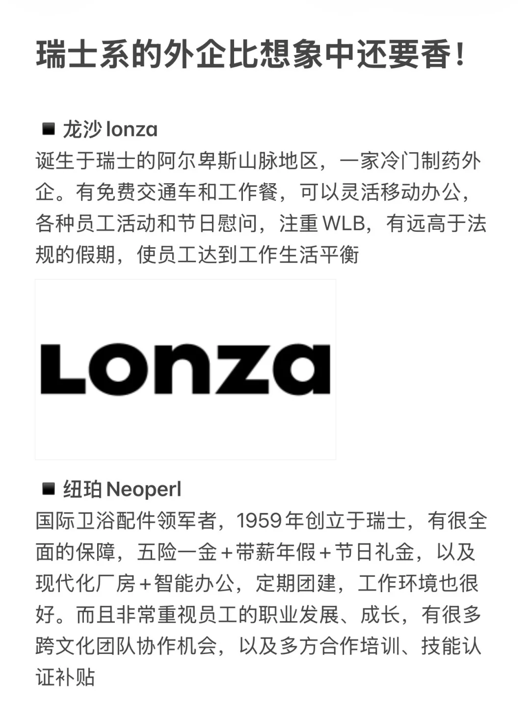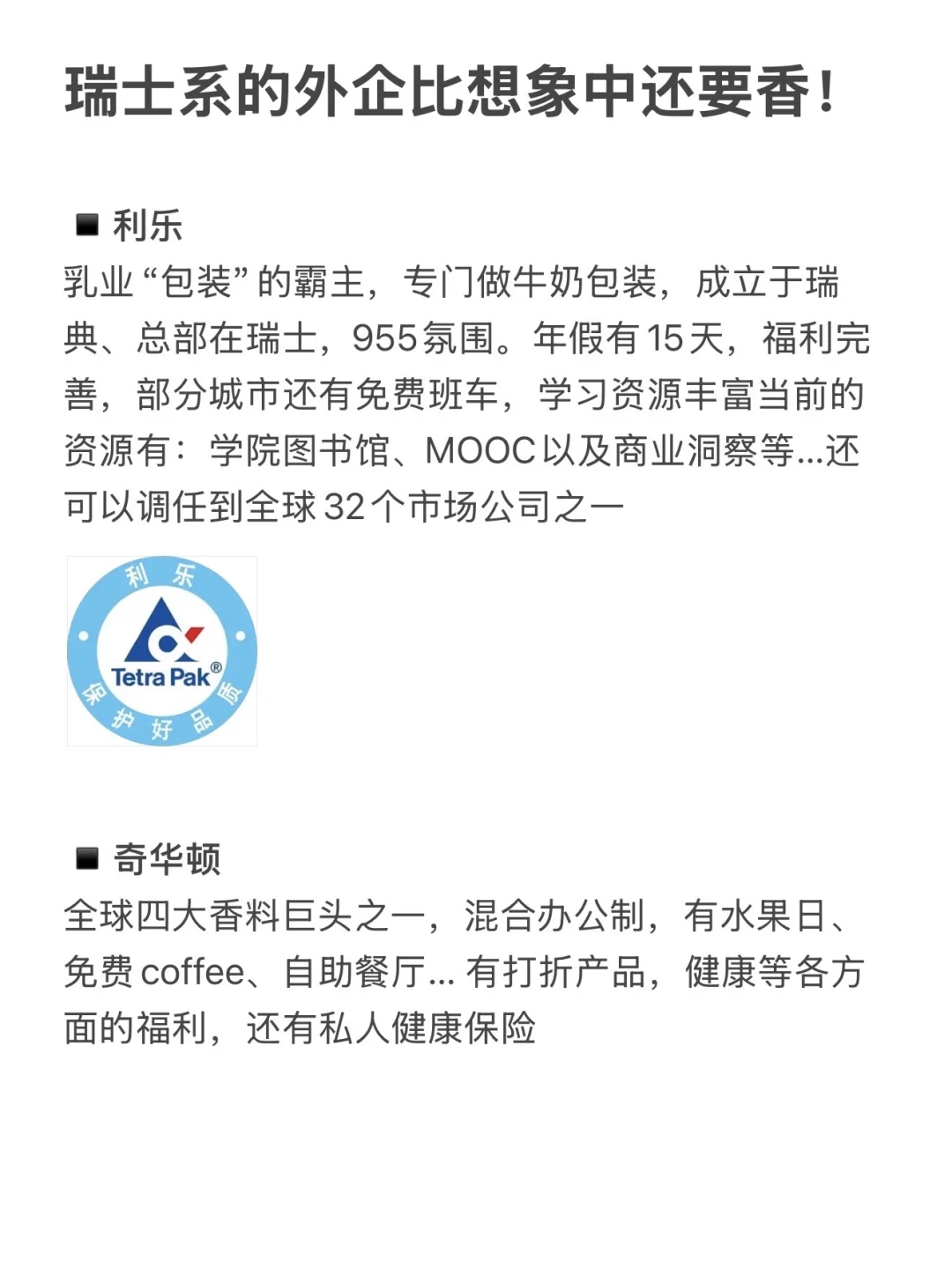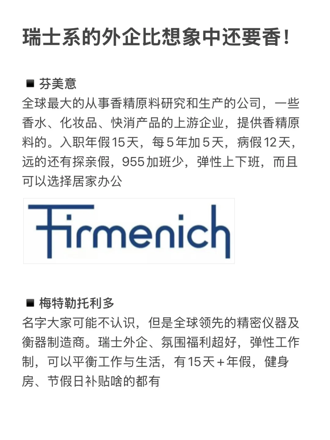 别再只盯着北欧和德国外企了,瑞士外企才是真正的六边形战士,高薪、稳定、高福利一样不落,堪称欧洲外企天花板,尤其是整体下班真的早,很好实现WLB . 为什么建议去瑞士外企 🔸13薪+绩效奖金+各种补贴,薪资水平全球领先 🔸25天+带薪年假,还有专属滑雪假,假期多到用不完 🔸每周2-3天居家办公,错峰上班不是梦 🔸五险一金顶格缴+补充商业保险,福利保障完善 . 坚持日更✊🏻,帮大家在找工作路上顺利拿到offer! .