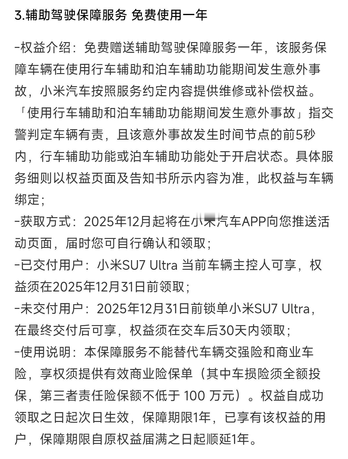 都在讨论第五条,小米SU7 Ultra的空气动力学前舱盖升级服务,其实第三条的辅助驾驶保障服务也很重要,小米的智驾险快来了,支持行车辅助和泊车辅助,并且是智驾退出5秒内都算[doge]