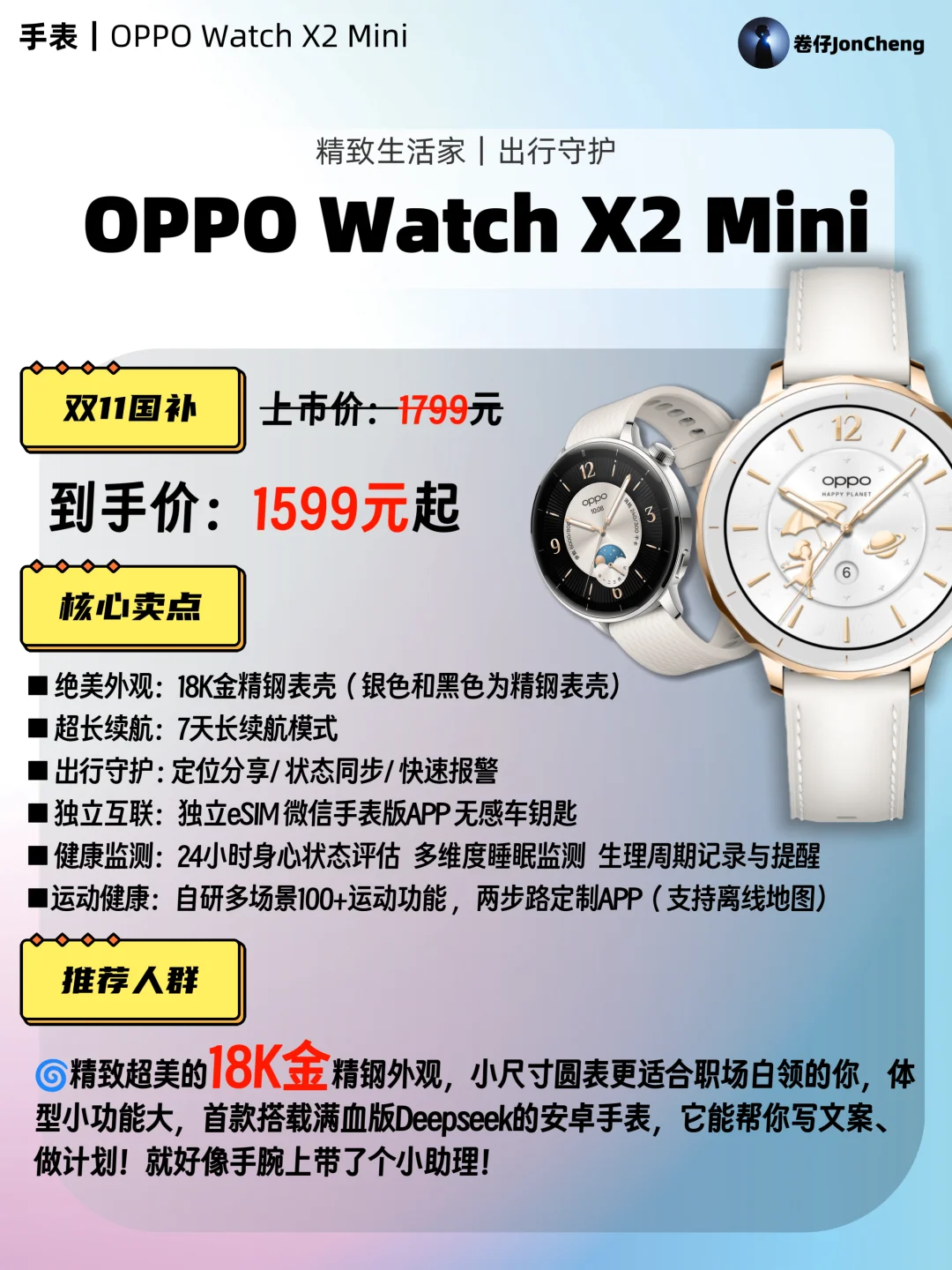 💍 Watch X2 Mini (女神专宠):双11到手价1599起!如果你是职场女生,精致18K金精钢表壳,身心状态评估&多维睡眠检测贴心实用,颜值高又不张扬,适配通勤与日常。