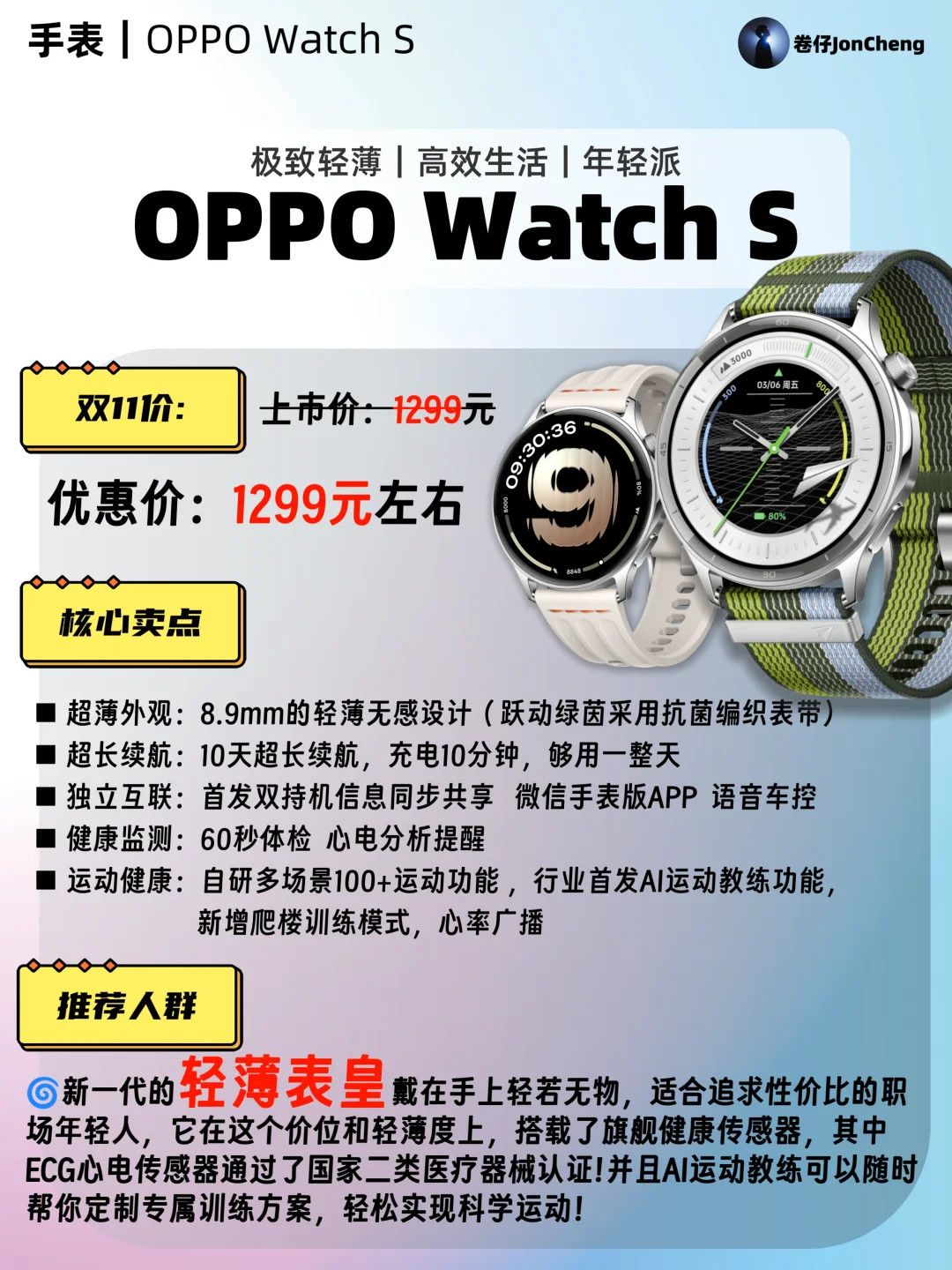 💸 Watch S (极致轻薄):上市价预计1299左右,如果你是热爱运动的职场年轻人,受够了厚重和续航焦虑,那么这款主打轻薄舒适+旗舰级健康体验+AI运动教练的表就是你的菜!闭眼入准没错!