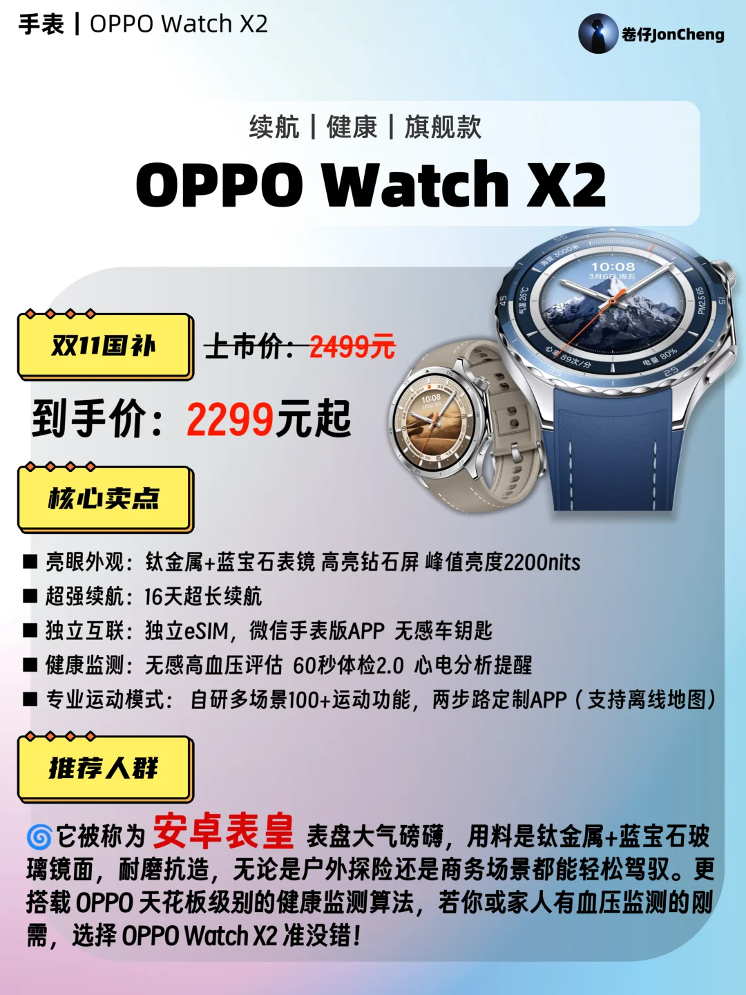 👑 Watch X2 (表皇待遇):双11到手价2299起!!如果你是公司中高管,想要奢华质感,功能体验全方位旗舰,选OPPO Watch X2吧!