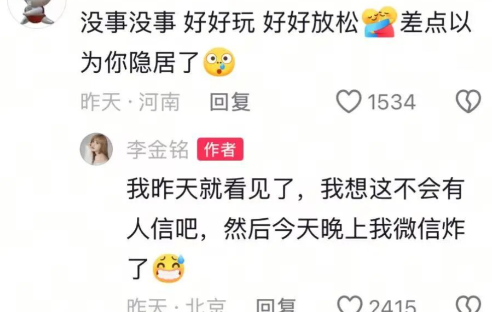39岁女演员近3个月未更新动态被传失联,本人晒照回应:震惊! 近日,演员李金铭连续三个月没有更新动态,引发猜测,昨晚,李金铭晒自拍报平安:震惊!我只是跑出去玩啦…… 在评论区她还暖心安慰网友 李金铭,1985年11月21日出生于山东省济南市章丘区,中国内地影视女演员、主持人,毕业于上海戏剧学院表演系。 2008年,主演《爱情公寓》,饰演古灵精怪的宅女陈美嘉从而获得关注。 来源:潮新闻