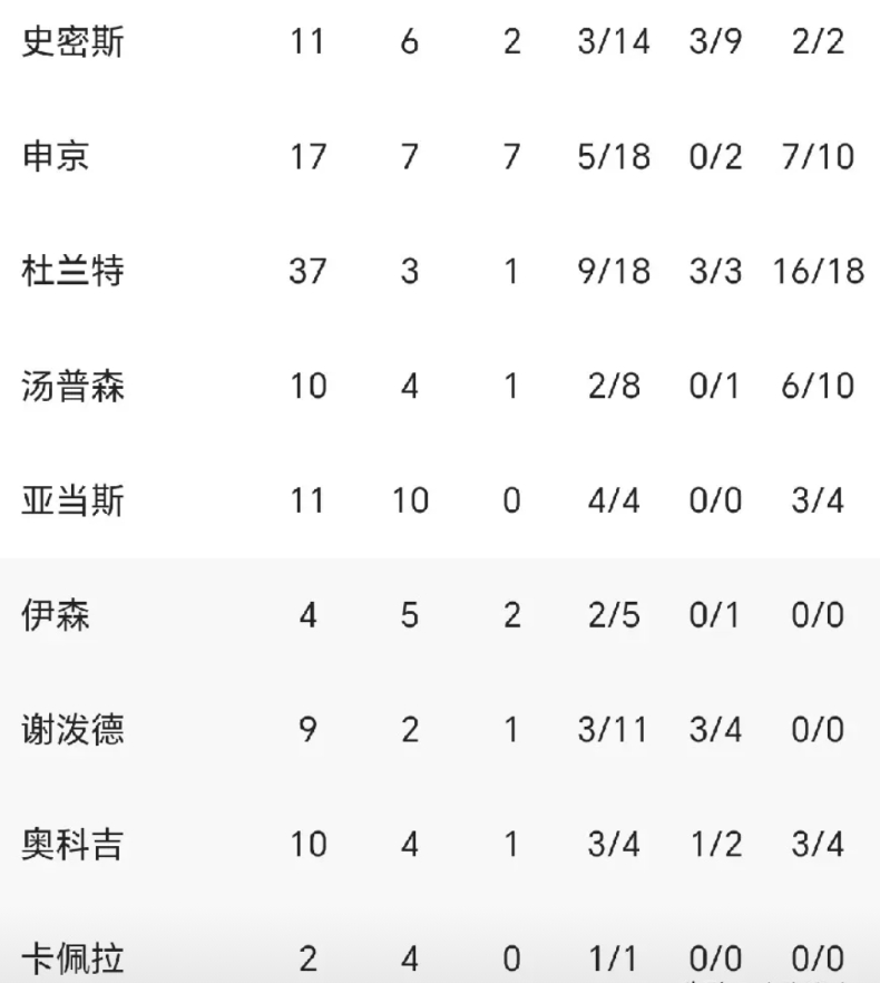开赛2连败!!火箭陷入没有控卫的麻烦!!数据不会说谎,看看谁应该为输球背锅: 1-申京 17+7+7 2-杜兰特 37+3+1 3-阿门 10+4+1 4-亚当斯 11+10 5-史密斯 11+6+2 6-伊森 4+5+2 7-谢泼德 9+2+1 8-奥科吉 10+4+1 9-卡佩拉 2+4