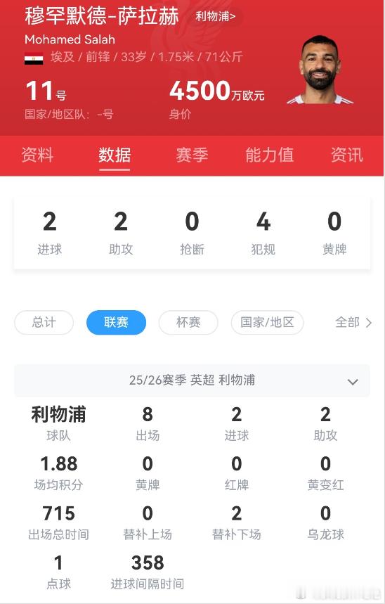 新赛季的萨拉赫状态明显下滑,多次在队友处于更好位置时仍选择强行单干,这让不少利物浦球迷感到失望。数据也不太乐观!英超8场仅贡献 2球2助攻,进球间隔长达 358分钟。