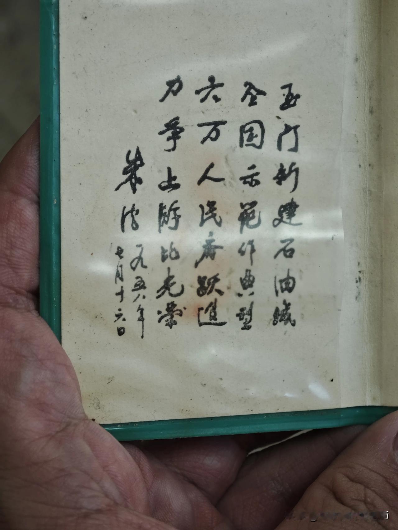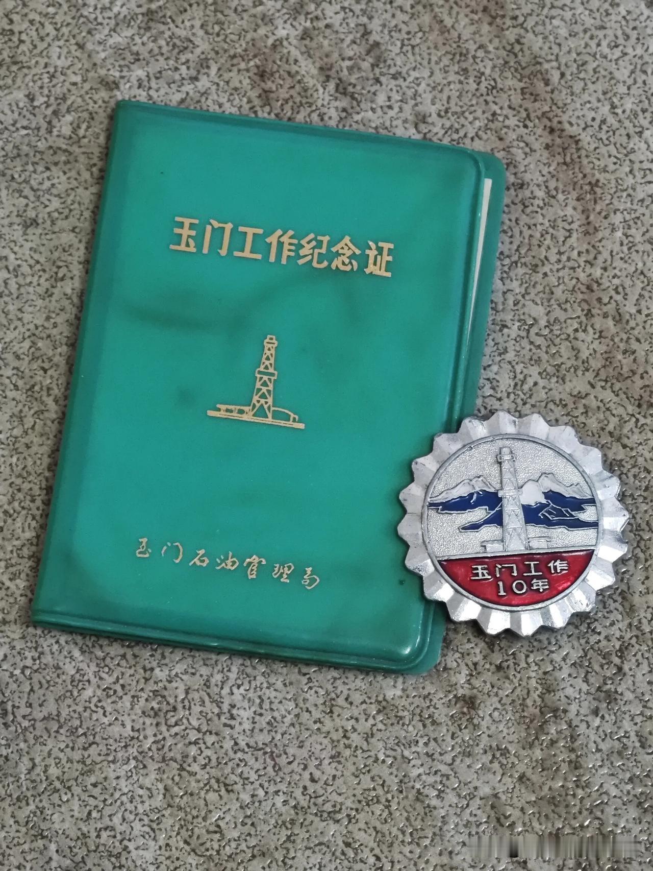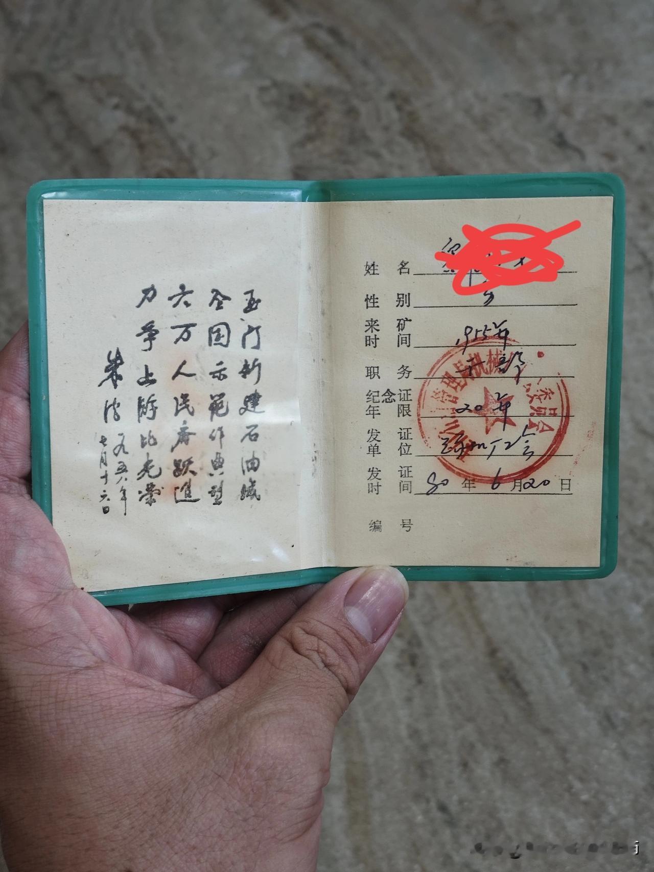 我的今日状态:💰期待暴富 我这里的天气:☀️晴天 这是玉门油田的职工纪念证及配套纪念玉门石油10周年工作纪念章,属于特上世纪80年代)玉门油田为职工发放的荣誉凭证类物品。 1. 纪念证: - 记录了职工信息(姓名、性别、入职时间、职务等),你的这张纪念证显示持有者为“刘x成”,1955年来矿,职务为干部,发证时间是1980年6月20日。 - 内页的毛笔字内容是“玉门新建石油城,全国示范作典型,六万人民齐跃进,力争上游比光荣”,体现了当时玉门油田的建设背景与精神风貌。 2. 玉门工作10周年纪念徽章: - 背面刻有“玉门油田 1979”,是1979年玉门油田发行的纪念章。 玉门石油的位置: 玉门油田(玉门石油)位于中国甘肃省酒泉市玉门市境内,地处河西走廊西端,南依祁连山、北靠戈壁滩,是中国第一个天然石油基地,被誉为“中国石油工业的摇篮”,也是“铁人”王进喜的故乡。