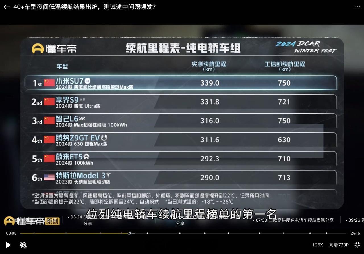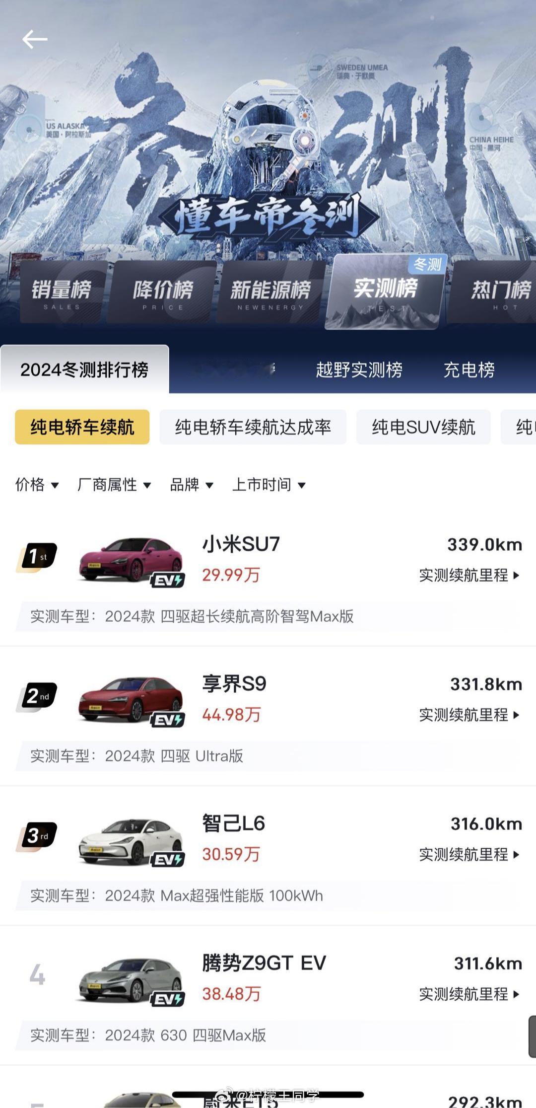 汽车之家的冬季续航测试出来了,小米YU7在北京10度低温的环境下,拿下了续航和续航达成率双第一