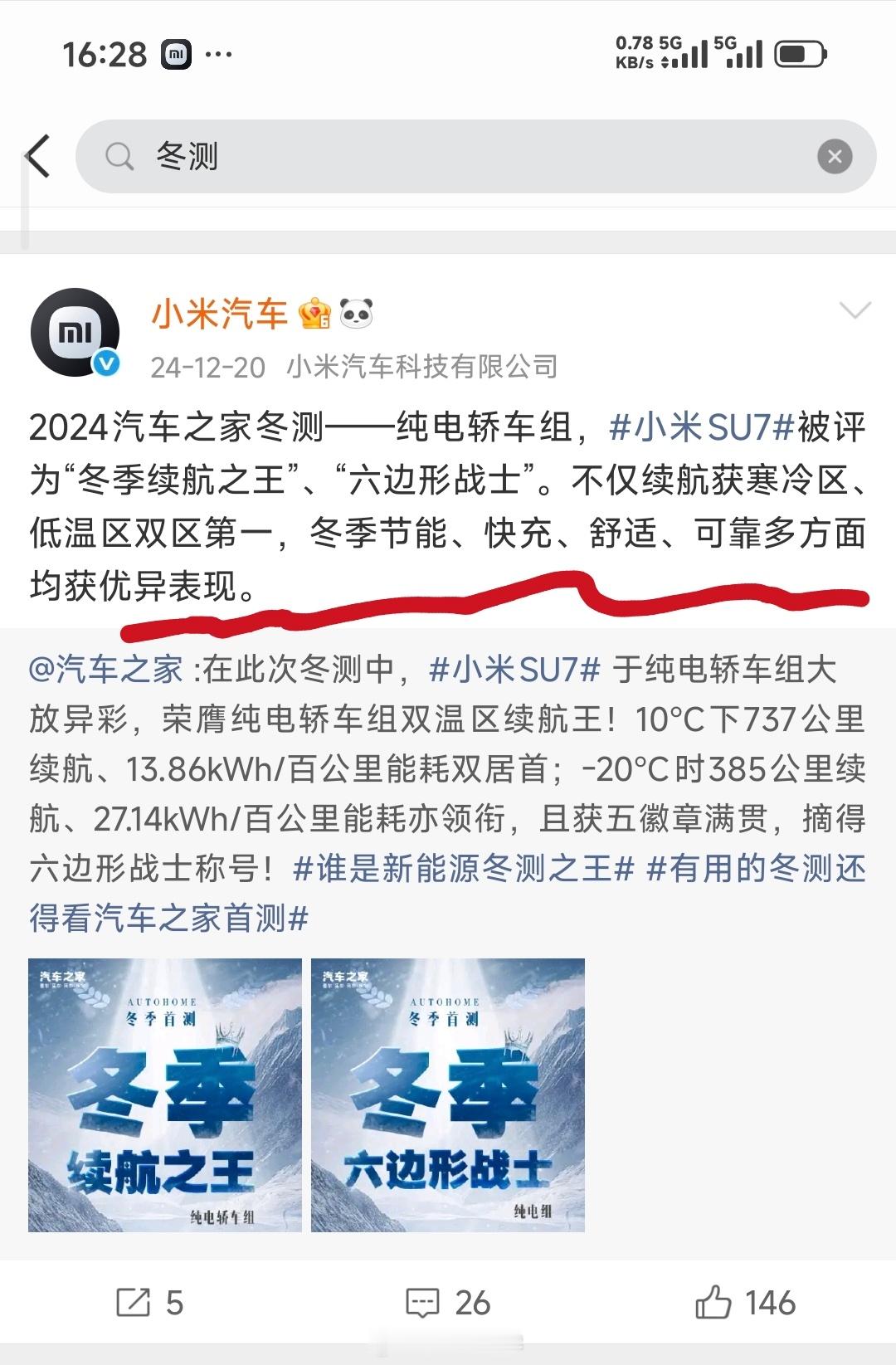 这两天汽车之家都开始搞冬测了,群友也在艾特我冬测结果,其实小米YU7这次冬测结果又是第一名,应该都在大家的预料之中。[哈哈]