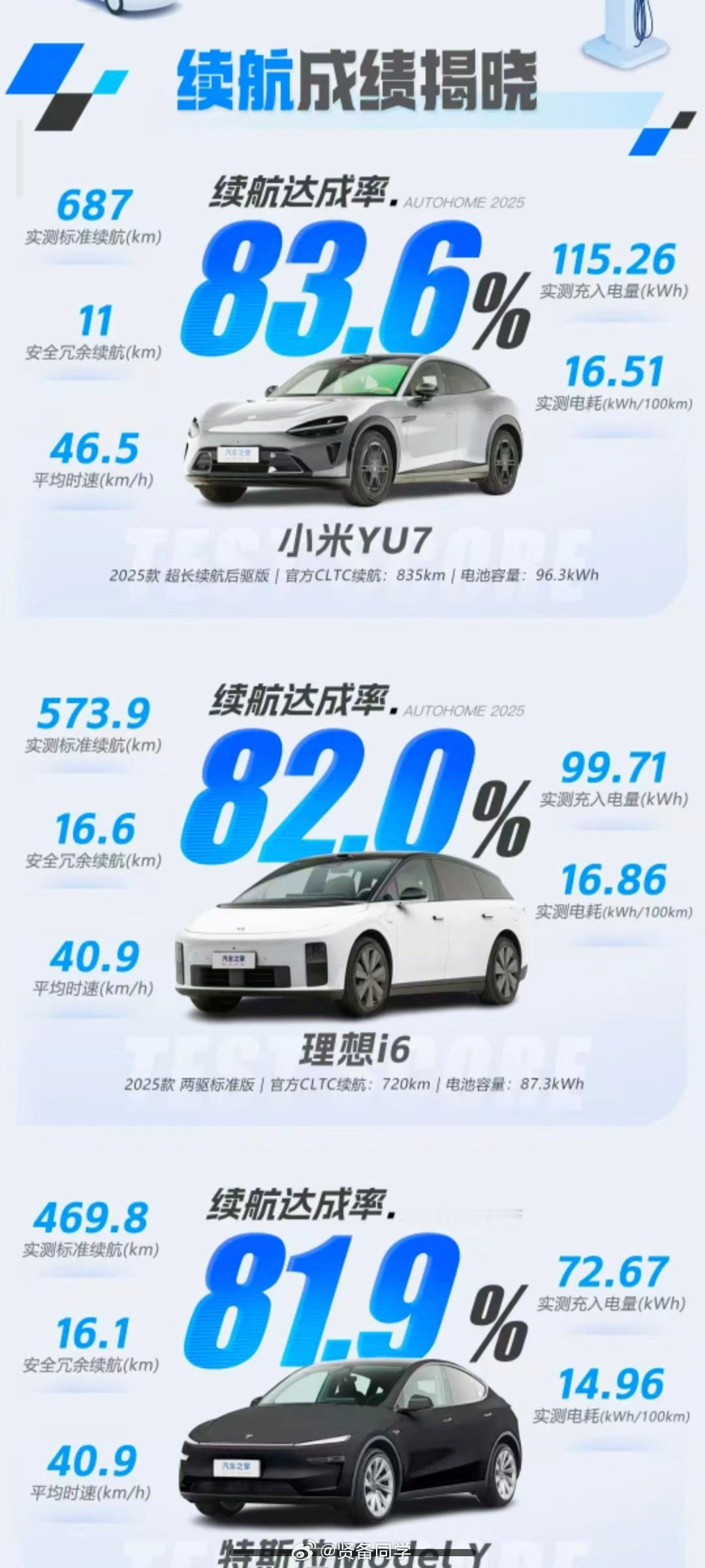 如果这个时候有人要说因为小米YU7的电池包大,是没错,但是看续航达成率,小米YU7依旧是第一名!