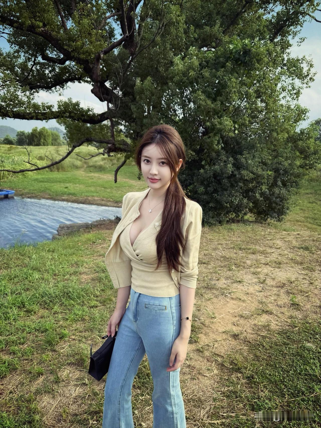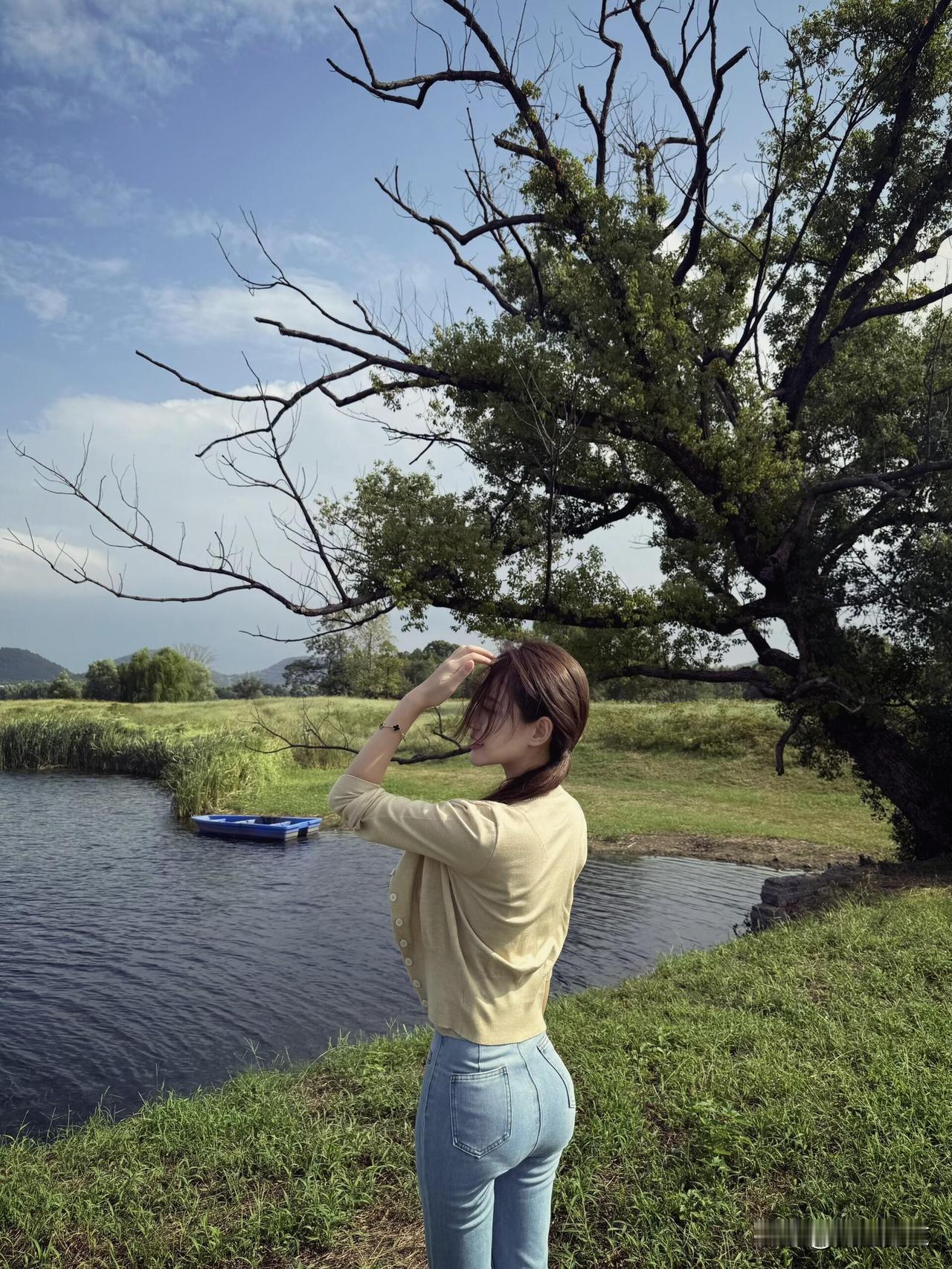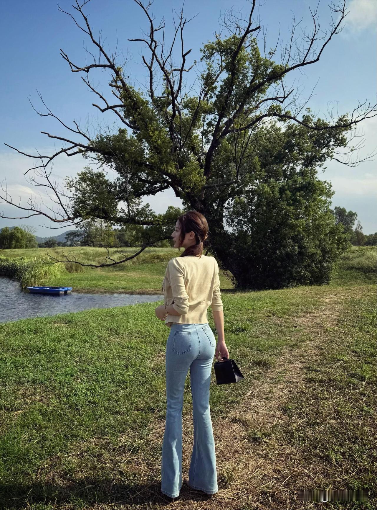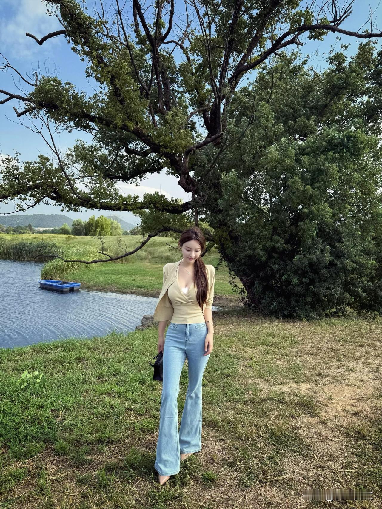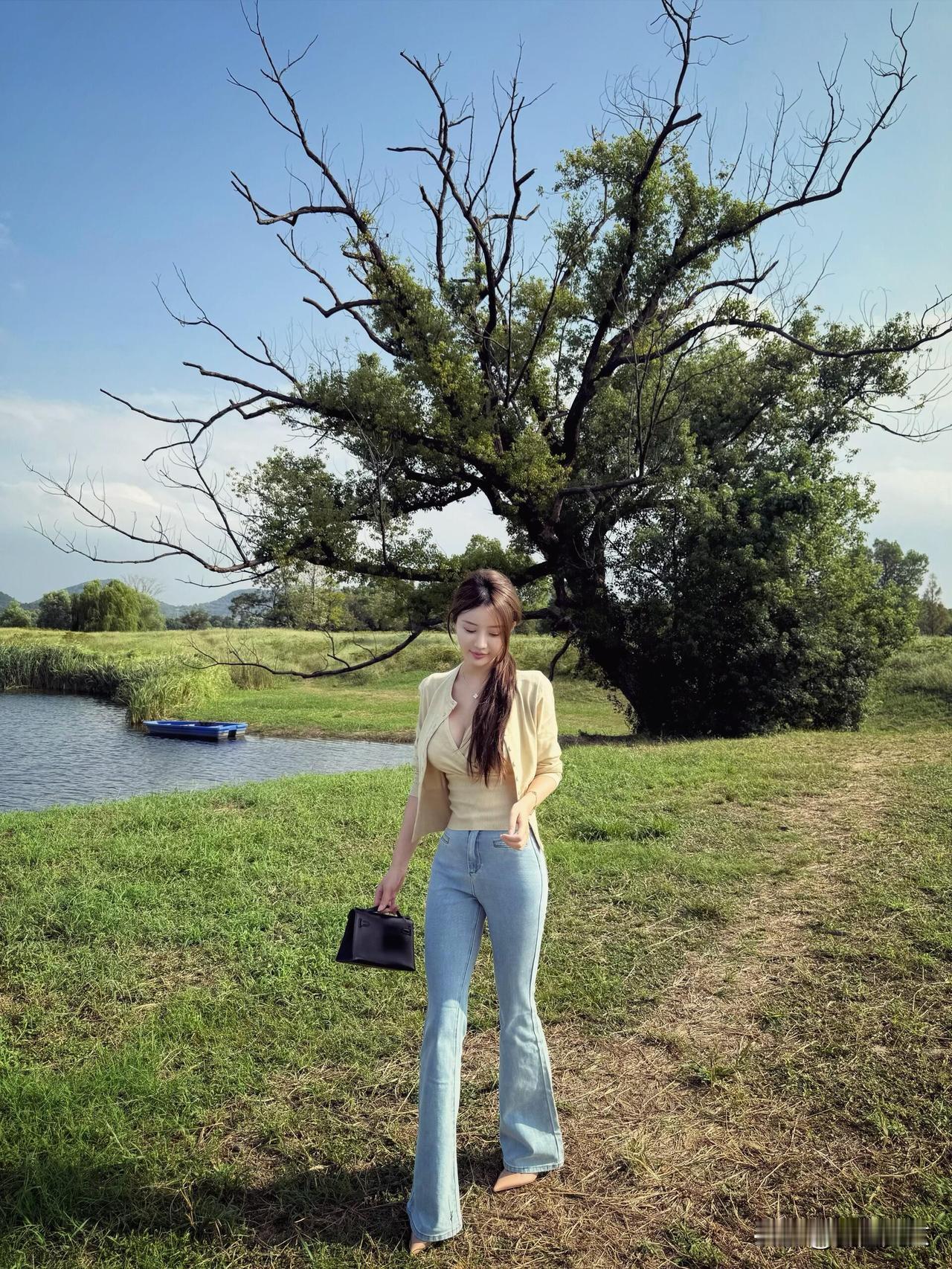 夏日清新穿搭,浅黄色上衣搭配牛仔裤,自然户外拍照,轻松自在。