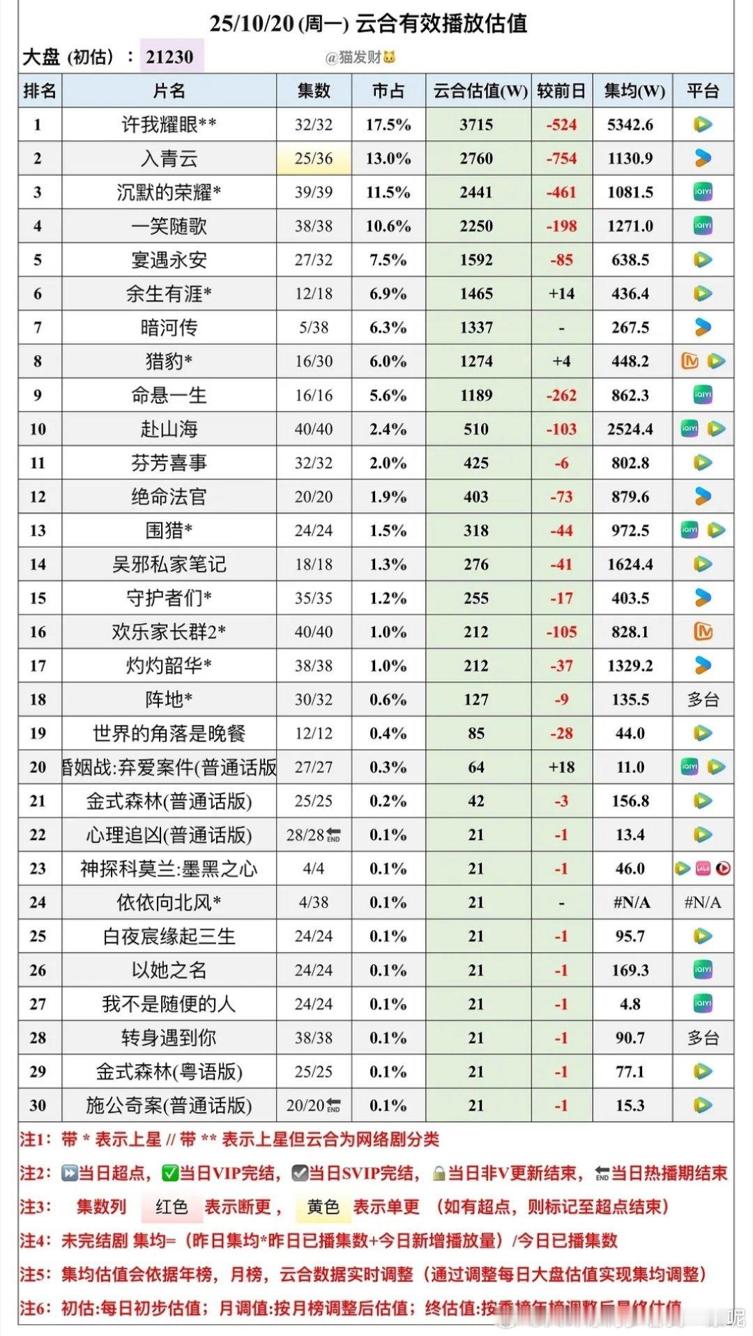 2025.10.20云合估值。赵露思,陈伟霆,许我耀眼总集均上了5342w。侯