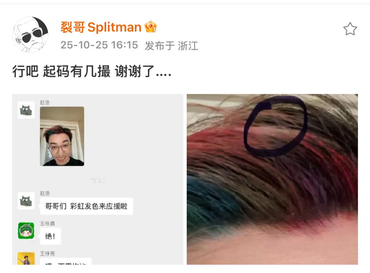 赵浩染哥几个应援色头发参加今晚的演唱会。 于是高喊“彩虹发色来了”,想着在哥几个群里炫耀一下的。 结果还是被苏醒挑出了毛病,因为粉色的就几撮。 张远也是反应强烈,说红色太多! 哈哈,还没出门就要翻车,这水真的很难端平。 我只想染满头红色。 带定位晒今日生活 我的今日状态:😁轻松愉快 我这里的天气:☀️晴天