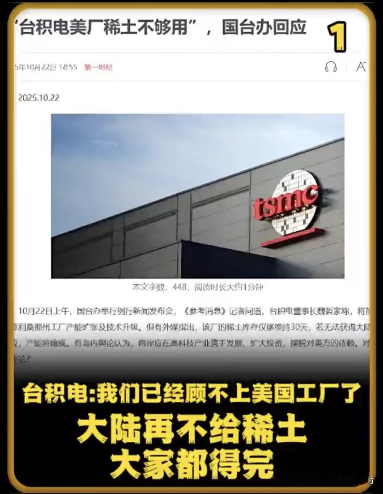谁能想到,台积电这艘“芯片航母”, 现在居然被卡在了“稀土”这道坎上? 以前跟着美国蹦得欢,现在库存快见底, 3000吨年用量,96%靠中国,想换供应商?根本来不及! 当年张忠谋放话:“断供大陆,他们就完了!” 结果转头就被现实打脸。 你掐我们脖子,没想到咱们手里攥着“稀土王牌”。 台积电是台湾的,根在咱中国, 可它偏偏帮着外人打压自家兄弟,真把事做绝了。 现在好了,风向一变,自己先慌了神。 老话说得好,做人留一线,日后好相见。 你不讲情面,就别怪别人亮底牌! 这波咱们不惹事,但也不怕事,稀土就是底气! 咱支持国家守住命脉!觉得挺解气的。 你觉得呢?对此你怎么看?