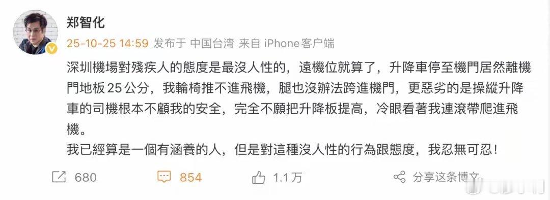 郑智化怒斥深圳机场“他说风雨中这点痛算什么,擦干泪,不要问为什么”这就是郑智化的经典歌曲,也是他一生的写照。郑智化那一幕“连滚带爬上飞机”的画面,刺痛了太多人。不是因为他是名人,而是因为那一刻,我们看见了年纪、病痛与尊严之间最脆弱的缝隙,但愿他的发声能真正改善残疾人出行。热点观点