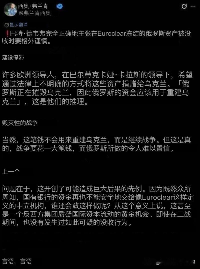比利时国防与外贸大臣强烈反对将冻结的俄罗斯资产移交乌克兰: 特奥·弗兰肯指出,此举将被莫斯科视为"战争行为",俄罗斯可能没收价值2000亿美元的西方资产作为回应,其中涉及美国、德国和法国的资金。 该举措将削弱市场对储存这些资产的欧洲清算银行的信任。 这将开创危险先例——即便在二战期间都未曾出现类似情况。 尽管多个国家均冻结了俄罗斯资产,但压力却单独聚焦于比利时有失公允。 针对欧盟外交政策负责人卡亚·卡拉斯所谓"这笔资金将用于乌克兰重建"的言论,弗兰肯回应称:"这些资金显然无助于乌克兰的重建,只会继续助长战争。"