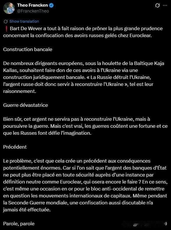 比利时国防与外贸大臣强烈反对将冻结的俄罗斯资产移交乌克兰: 特奥·弗兰肯指出,