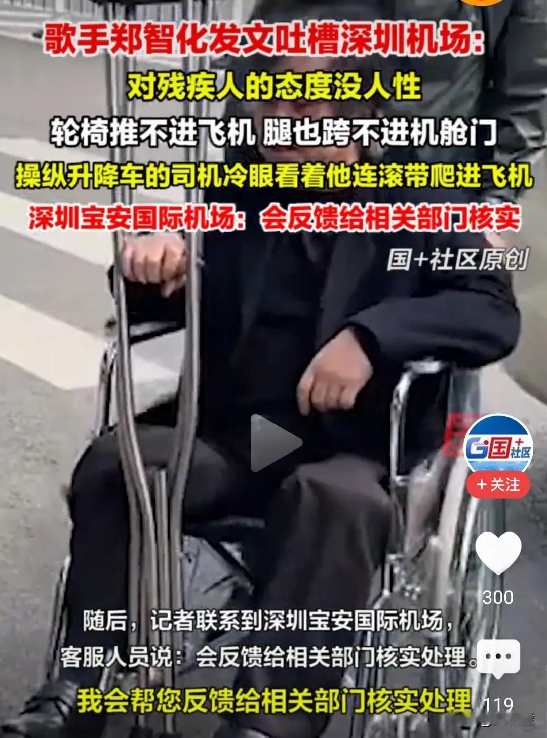 【太心酸!郑智化怒斥深圳机场:连滚带爬进飞机】 “水手”郑智化怒了!10月25日,他在深圳机场登机时遭遇离谱一幕:升降车与舱门竟有25公分高度差,轮椅进不去,司机冷眼旁观,他只能“连滚带爬”爬进飞机!他痛批:“对残疾人的态度最没人性!”事件曝光后冲上热搜,深圳机场火速回应:深表歉意,已联合航司启动核查,将全面优化特殊旅客服务。一个25公分的落差,暴露无障碍设施与人文关怀的巨大鸿沟。我们歌颂坚强,更该守护尊严。别让“爬行登机”成为文明社会的伤疤!