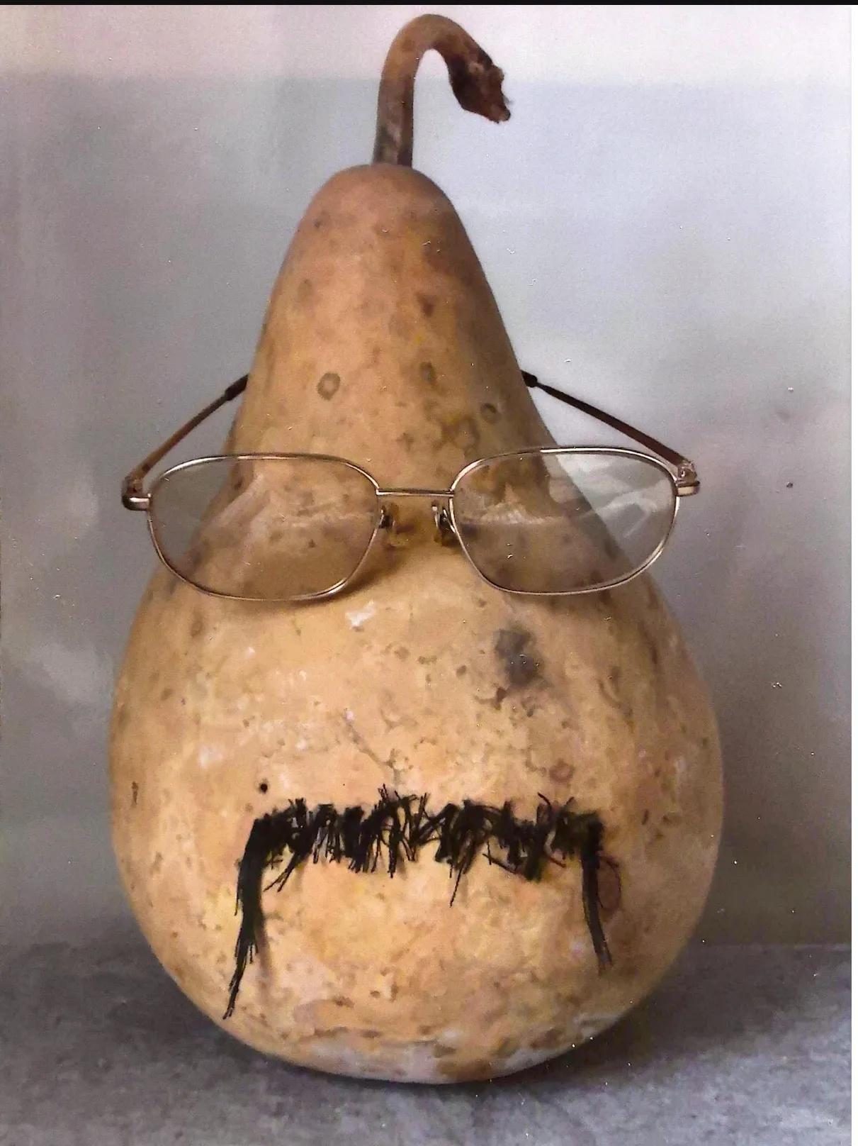 请欣赏我的艺术作品 到郊区春游的时候,买了一个葫芦, 找一块破布,撕下一点布絮,做成胡子, 把我的眼镜放上去, 就是一件出色的工艺品 无价之宝