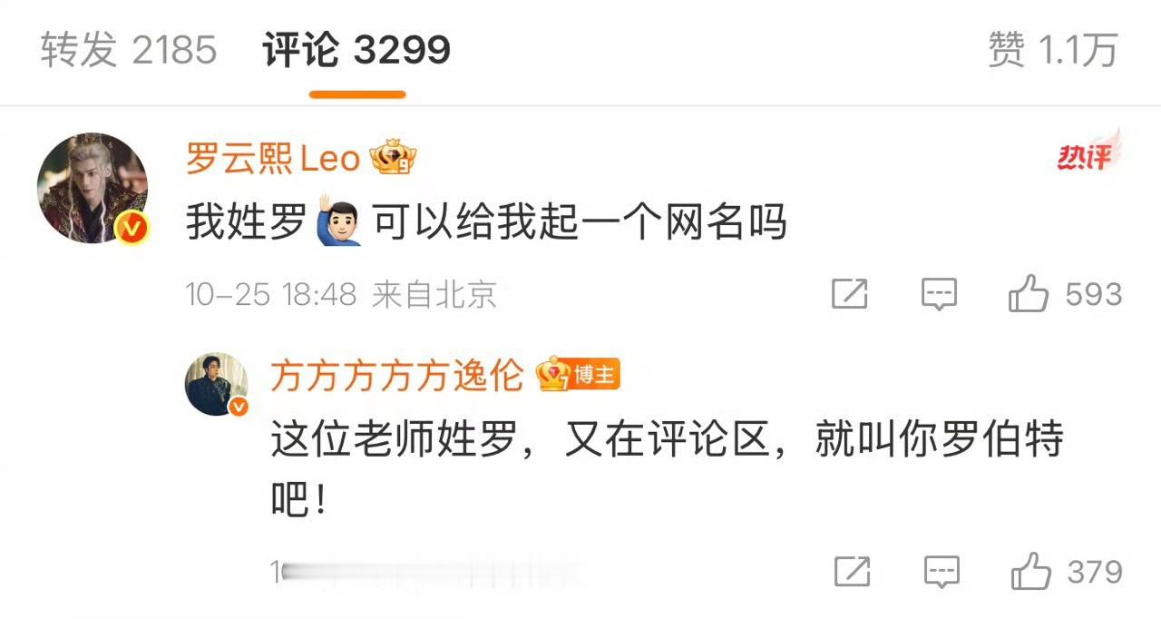 方逸伦叫罗云熙罗伯特 剧里柳眼是起名大师,剧外方逸伦是造梗王者!罗云熙一句“求网名”,方逸伦秒回“罗伯特”,这谐音梗真是被他玩明白了~