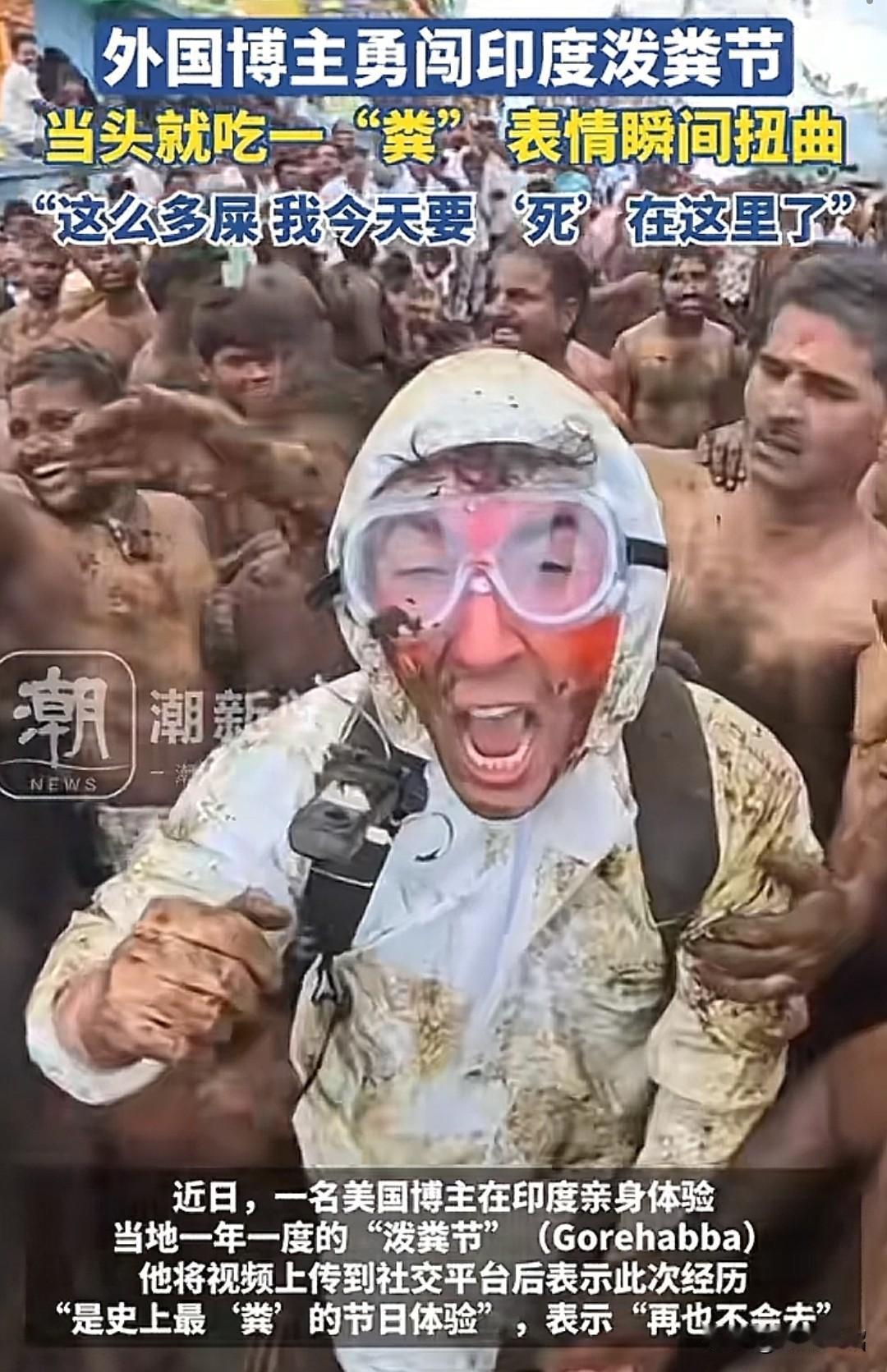 印度人总能刷新我的认知,虽然说是他们的文化习俗,但是还是忍不住的让我泛起一阵恶心。 外国博主勇闯印度泼粪节,想体验一下他们特殊的传统节日,看得出他很兴奋,来玩这个还请了保镖,在边上护着他,不然身上没有那么干净。 全身上下最该挡住的是嘴,他偏偏漏出来,还张的老大了,我怀疑他就是单纯想吃。