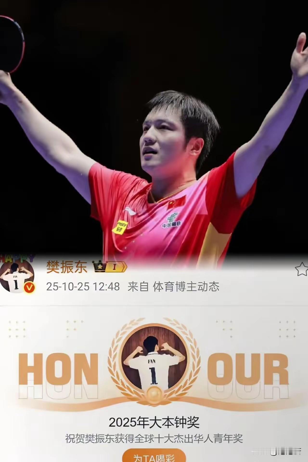 大家有没有发现, 要不是因为樊振东获奖了, 估计都没有人知道这世上还有这么一个奖项,那就是大本钟奖! 这个奖项名字一看都觉得听都没听过,查了一下才知道,原来这个奖是颁给那些全球华人最有影响力的。 不过要不是樊振东这么有名,大家估计都不知道还有大本钟这个奖的存在呢,他获得这个奖真的是实至名归! 之前因为他,不少人开始关注德甲,现在又因为他,这个华人影响力奖项被更多人看见。他早不只是中国乒坛的冠军,更像是一张“移动的中国体育名片”,走到哪,就能把中国运动员的影响力带到哪。 当然,一个大本钟奖根本装不下樊振东的优秀,他在赛场上的拼劲、场外的低调沉稳,才是真正让他圈粉的原因。