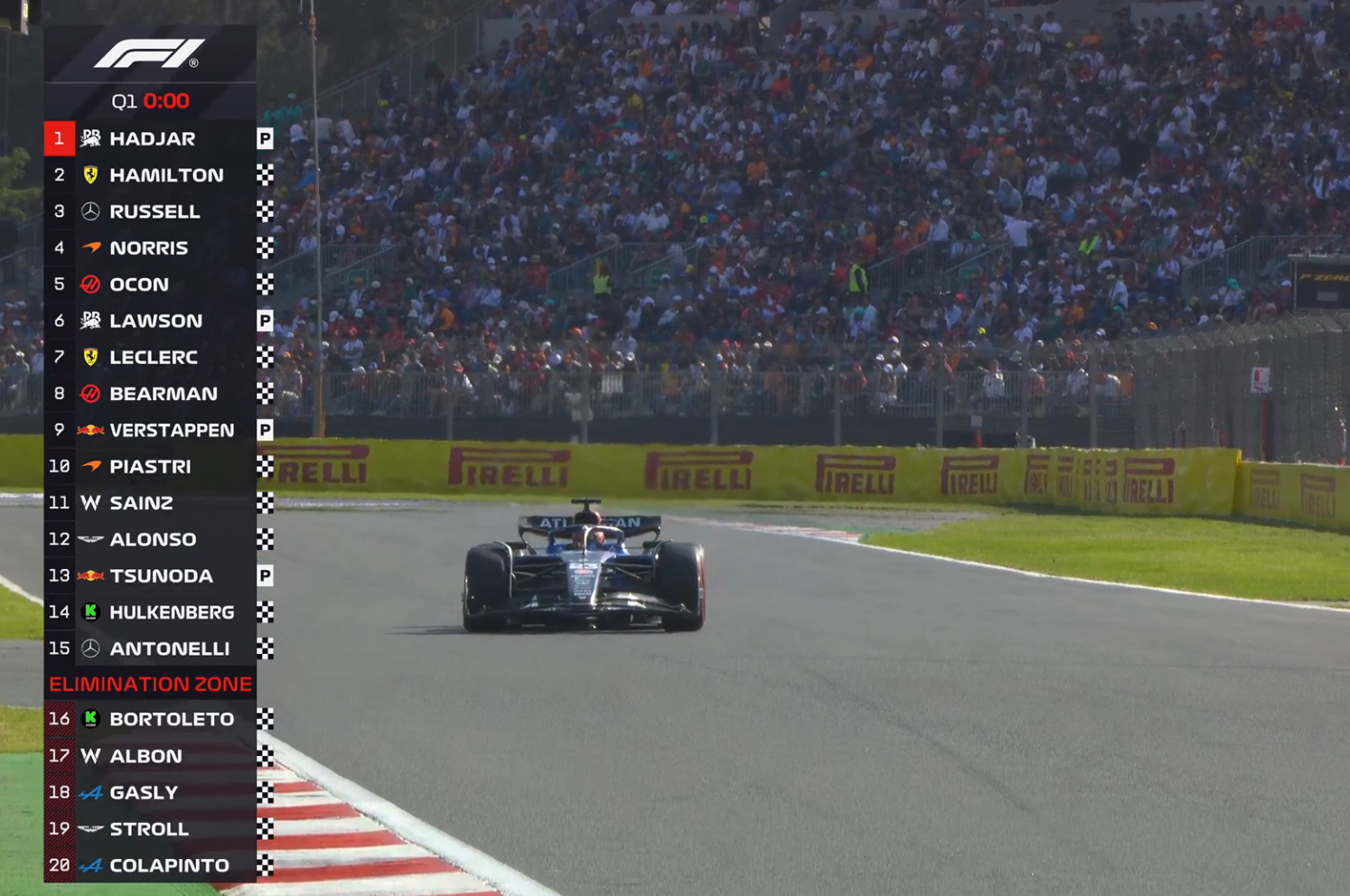 哈贾尔Q1第一名1:16.733 最后刷圈非常精彩,安东内利1:17.291惊险晋级!博托莱托、阿尔本、嘉斯利、斯托尔和科拉平托被淘汰。
