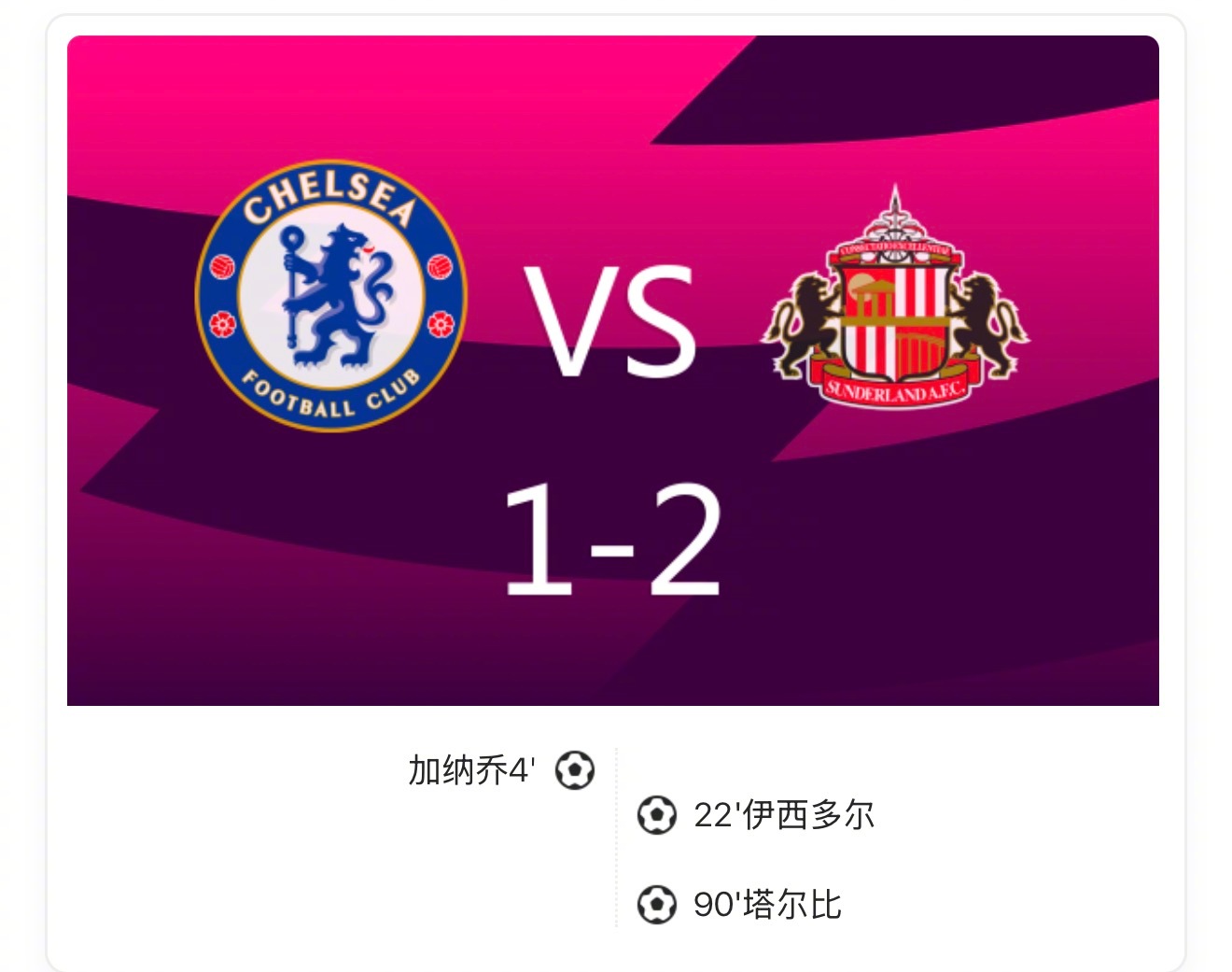 【战报:切尔西1比2桑德兰,加纳乔首球,塔尔比绝杀】开场仅4分钟,加纳乔抽射破门。22分钟,伊西多尔乱战扳平比分。93分钟,布罗比助攻,塔尔比推射绝杀。