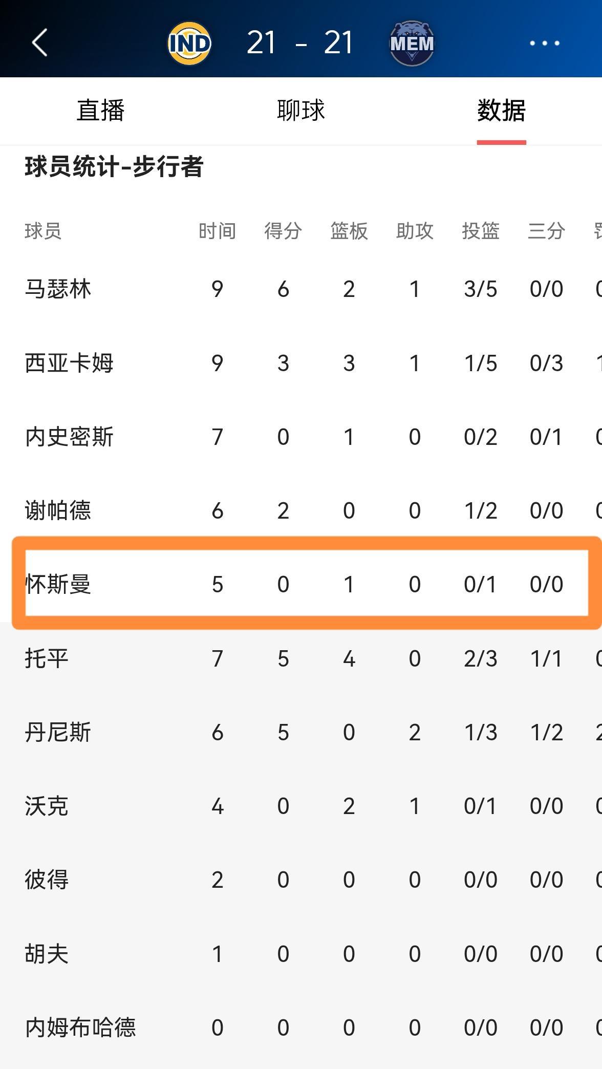 步行者中锋怀斯曼真是烂泥扶不上墙!在今天步行者客场挑战灰熊的比赛中,目前双方的第一节比赛已经结束,两队战成了21平。让人感到无比失望的是,在第一节比赛中,出任步行者首发中锋的怀斯曼在出战的5分钟里毫无建树,他投篮1中0怒砍0分,只抢到了1个篮板球,他的场上正负值为全队最低的-7。 作为一名身体素质出色的年轻内线,怀斯曼竟然只抢到了可怜的1个篮板球,真是让人失望透顶。