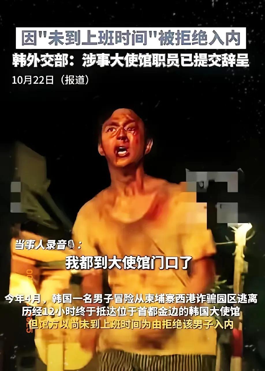 看的人心碎和绝望 被骗进电诈园没垮,被打得浑身是伤没哭,徒步12小时逃出来也没绝望——支撑他的! 不就是“到大使馆就安全了”这口气吗?可金边韩国大使馆那句“没到上班时间”,直接把他最后一点希望砸得稀碎。 凌晨六点的使馆门外,他抖着求“哪怕在停车场躲躲”,是冷冰冰的拒绝。那两个小时的等待,比12小时逃亡还难熬,毕竟身后就是可能被抓回的地狱! 所谓的“保护”从来不该卡着上班点, 大使馆该是绝境里的光,不是讲流程的办公室。规则是死的,人命是活的! 迷茫!是该先守规矩,还是先救人命?