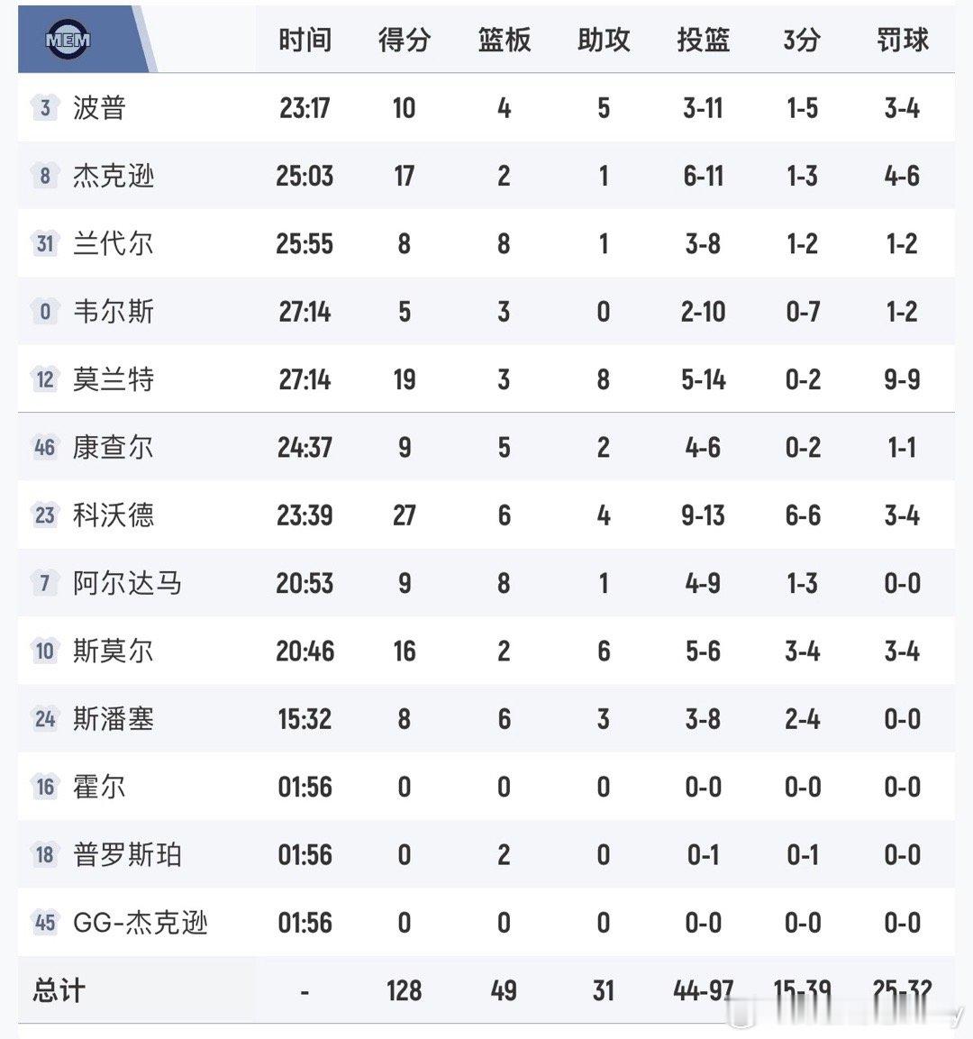 灰熊新秀科沃德27分6篮板4助攻,莫兰特19分8助攻,杰克逊17分
