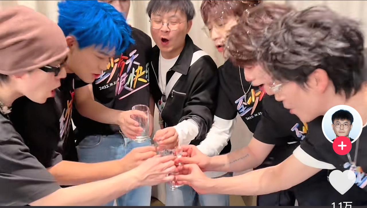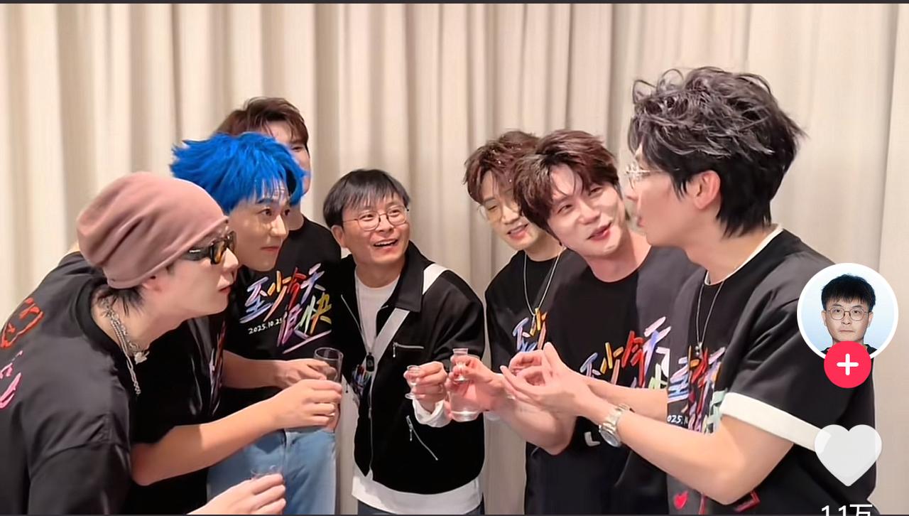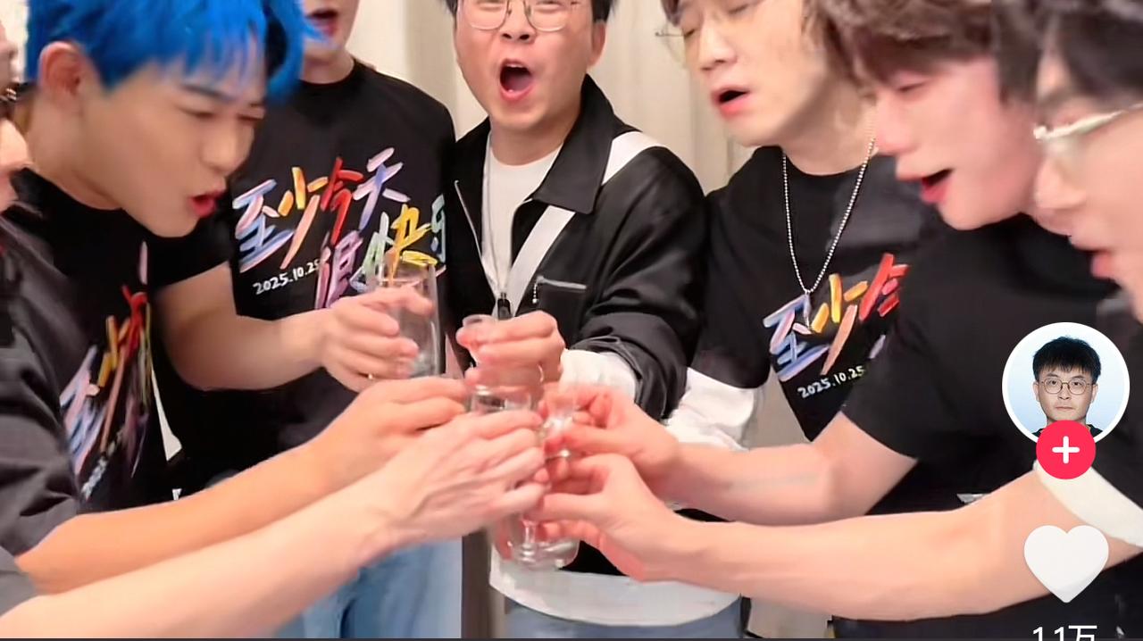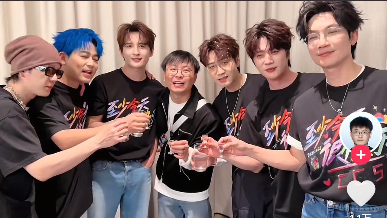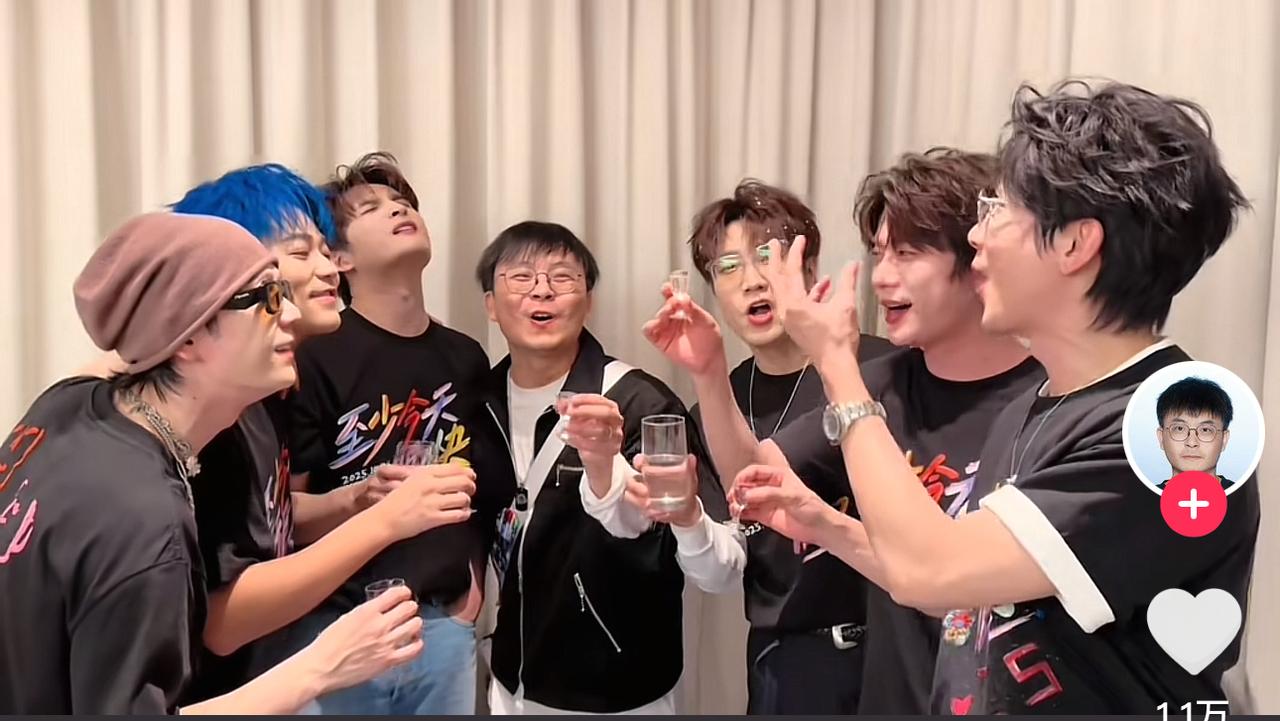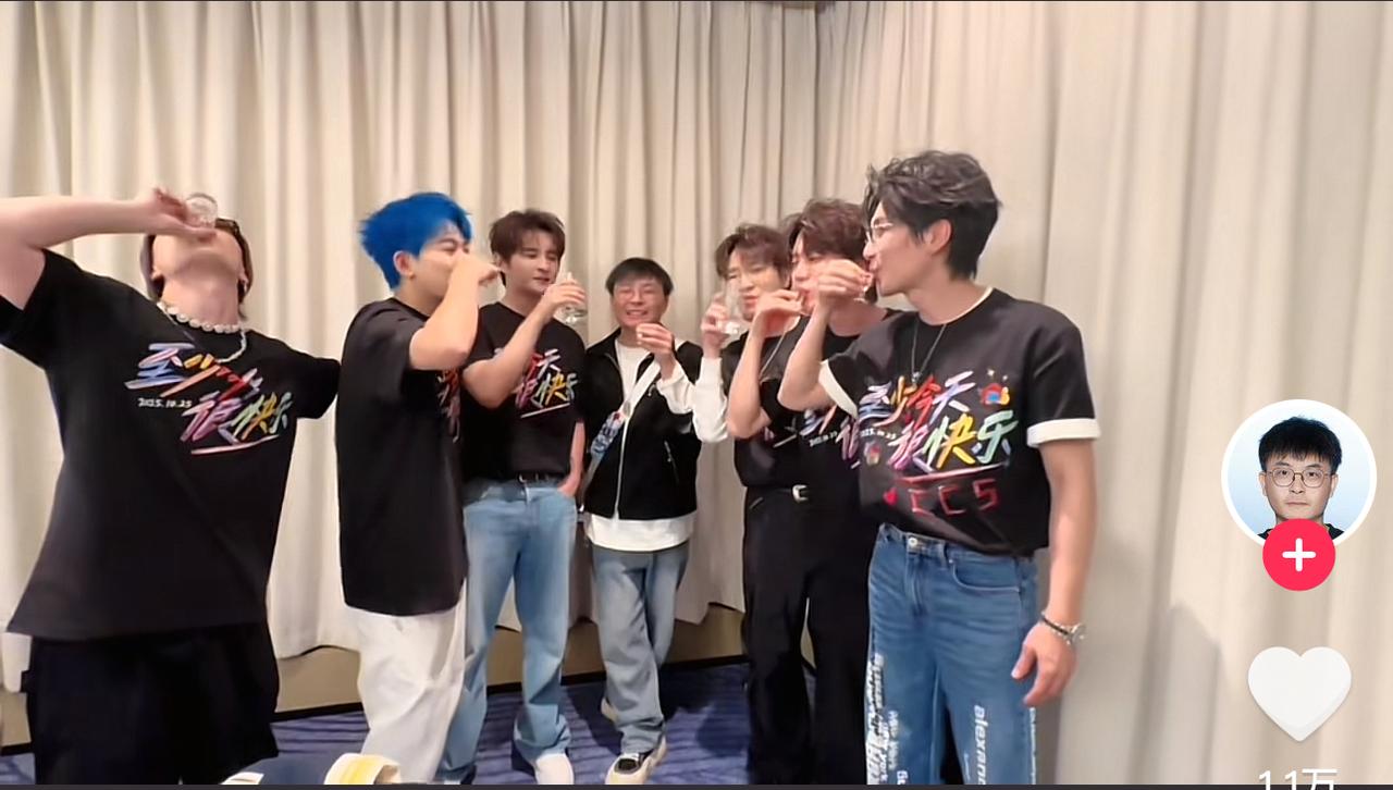 大林林演唱会后与哥几个喝🍸庆功! 还是陈楚生点子多,碰个杯还耍个花样,哥几个好宠他。 通过酒杯也看出了端倪—- 亮哥与张远喝的是白开水。 生哥、虎子、苏醒与小林林童鞋用的小酒杯,货真价实的“白茶”。 糊糊酒杯好像大一号,他是一饮而尽,感觉他最豪爽。