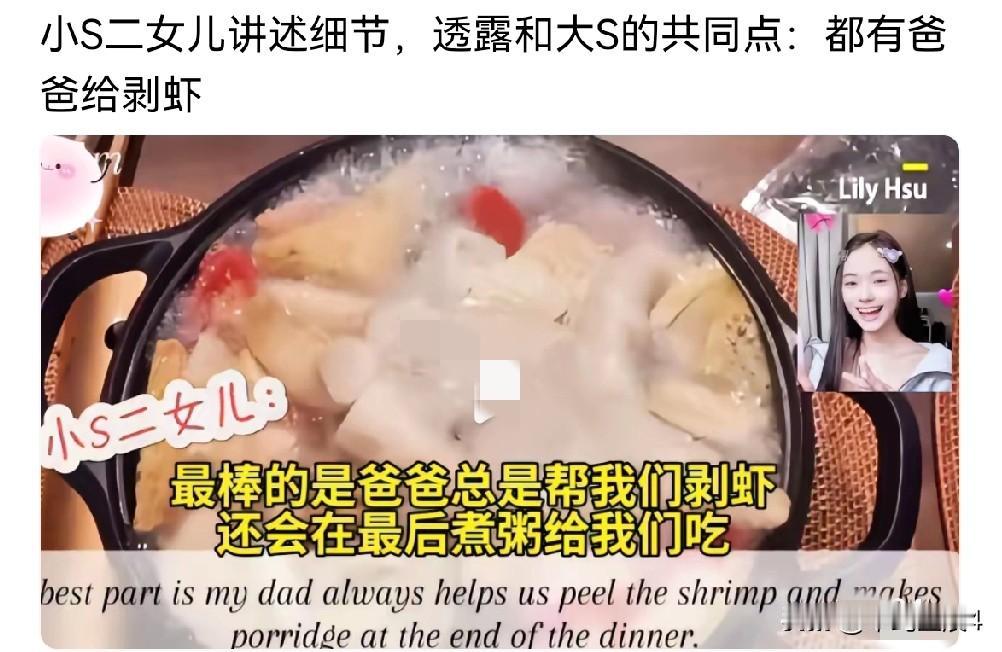 大S这个剥虾梗算是过不去了,小S二女儿近日晒美食,用流利的英文介绍爸爸做的美食,还称赞许雅钧是最棒的爸爸,总是剥虾给她们吃。 二女儿还真的跟姨妈很相似呀,不知道是不是姨妈教的,大S曾在节目中说过,从小都是爸爸剥虾给她吃,妈妈说剥虾一定要男人帮你剥,所以,大S说如果有人帮她剥她就吃,没人帮她剥她就不吃,汪小菲识趣的给大S剥了个虾!哈哈! 没想到,大S分享的生活趣事被网友拿来调侃,小S二女儿也拿来炫耀,爸爸剥个虾是什么大事吗?她家怎么总跟虾过不去了?[捂脸]