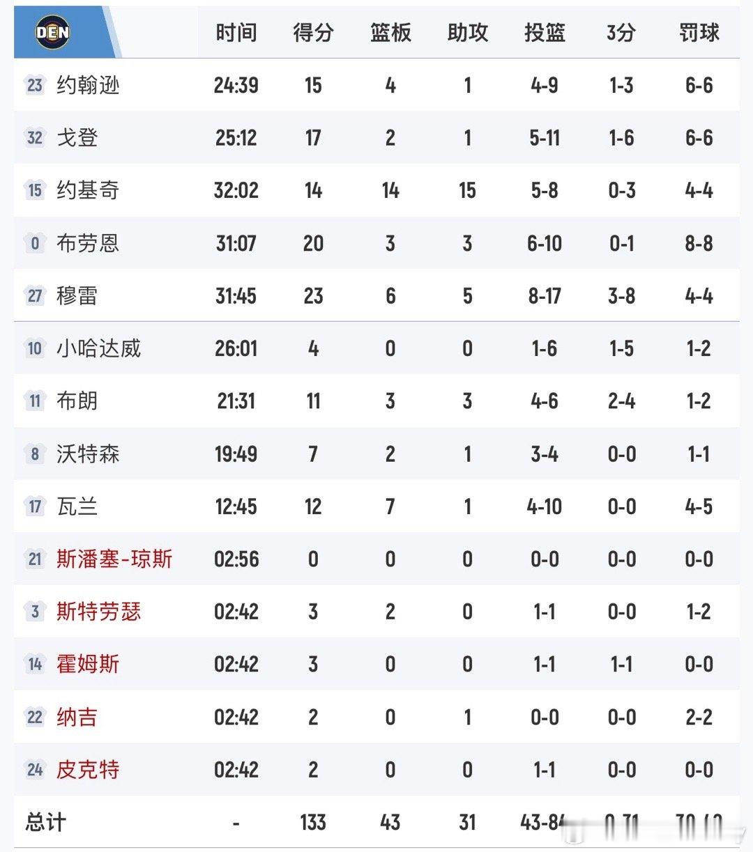 约基奇14分14篮板15助攻,穆雷23分6篮板5助攻,布劳恩20分。